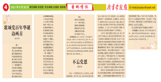 老同志们的亲身经历是党史国史生动具体的反映,是党史学习教育丰富的营养剂。1944年入党的离休干部陈德仓的回忆短文《不忘党恩》和1960年在高中时期入党的老党员汪孔田撰写的《歌颂党百年华诞诗两首》在《亚星在线登录官网报》的刊登,激发了广大师生对党、对祖国、对中国特色社会主义的无比热爱,提高了学校党史学习教育实效。