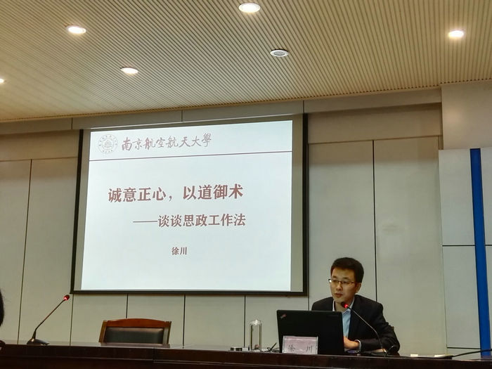 徐川在行政楼C301会议室作了题为《诚意正心,以道御术——谈谈思政工作法》的专题报告。徐川结合自己多年从事大学生思政工作的丰富经验,深入浅出地阐述了思政工作的“道”与“术”。他以思政工作的“初心”为切入点,首先分析了学习思政工作法的三个误区,认为思政工作者需要学习的“是方法不是事迹”,“是内容不是形式”,“是路径不是结论”;随后,他提出了做好思政教育的应有情怀和基本态度,即“道”的问题,强调做好思政工作,要把对国家的真心、对组织的真心和对青年的真心融入思政教育工作中;最后,他进一步阐释了思政工作法的“六扇门”,即思政教育中“术”的问题:“换位思考,把自己摆进去;因材施教,一把钥匙开一把锁;回应关切,注重解决学生实际问题;深入浅出,用故事讲道理;拓展途径,学生在哪里,工作就在那里;汇聚力量,把我变成我们”。报告说理透彻,案例详实,语言生动,不时博得阵阵笑声和掌声,引发大家深入思考。报告娓娓道来,沁人心脾,实在,用情,很受启发,作为思政工作者,要用心去悟,用心去学,真心去做,灵活变通,努力把我校的学生思想政治工作推上新的台阶。