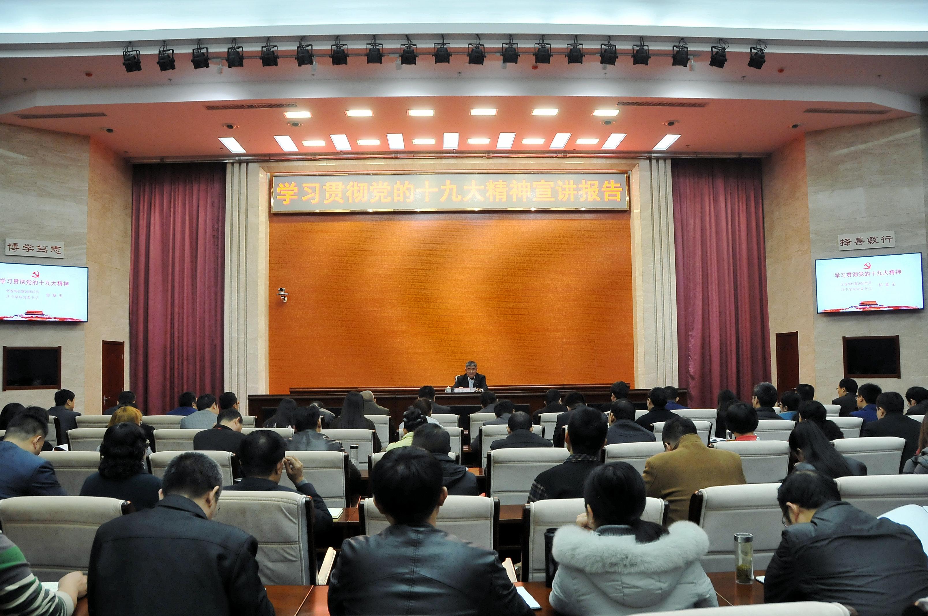 郁章玉从四个方面对十九大精神进行了系统深入的阐释。一是全面领会党的十九大报告的精神实质。郁章玉指出,认真学习宣传贯彻党的十九大精神,是当前和今后一个时期首要的政治任务。十九大鲜明特点主要是:特别突出人民中心,特别体现创新发展,特别重视中华文化,特别彰显社会主义,特别强调党的领导。郁章玉按照中央、省委及省委高校工委的部署要求,紧紧围绕习近平新时代中国特色社会主义思想这条主线,讲清楚了十九大的鲜明主题,讲清楚了习近平新时代中国特色社会主义思想的丰富内涵,讲清楚了十八大以来党和国家事业发生的历史性变革,讲清楚了中国特色社会主义进入新时代的重大意义,讲清楚了我国社会主要矛盾变化的深远影响,讲清楚了“两个一百年”奋斗目标,讲清楚了坚定不移全面从严治党的重大部署,把广大师生员工的思想和行动统一到十九大精神上来。二是全面领会党的十九大关于教育优先发展的思想精髓。郁章玉指出,我们要旗帜鲜明地将习近平新时代中国特色社会主义思想作为行动指南,在教育优先发展进程中坚持正确办学方向。要深刻认识优先发展教育事业的重大意义,准确把握教育优先发展进程中高等教育的历史使命,切实加强在教育优先发展进程中党对学校的全面领导。三是全面领会党的十九大关于坚定文化自信的核心要义。习近平总书记在十九大报告中深刻阐述了文化自信的深厚基础和重要地位,为坚持中国特色社会主义文化发展道路,激发全民族文化创新创造活力,推动社会主义文化繁荣兴盛,建设社会主义文化强国指明了正确方向,提供了重要遵循。我们要深刻认识坚定文化自信的重大意义,坚定文化自信是推进“四个全面”战略布局的精神支撑,是实现中华民族伟大复兴的内在要求,是坚定道路、理论、制度自信的重要基础,是文化交流中讲好中国故事的重要保证;要准确把握文化自信的内涵和源泉,我们要明确中华优秀传统文化是文化自信的历史根基,中国革命文化是文化自信的生动实践,社会主义先进文化是文化自信的现实依据;要准确把握区域文化优势,坚定文化自信,山东作为中华优秀传统文化杰出代表儒家文化发源地,具有独特的区位优势,党中央对山东发展特别是文化建设高度重视、寄予厚望,习近平总书记到曲阜视察,发表了弘扬中华优秀传统文化的重要讲话,山东省、济宁市、曲阜市都高度重视文化建设,分别制定了文化强省和文化强市发展战略,我校地处孔子故里办学,并是万里母校,还是九十一年前鲁西南第一个中共党支部的诞生地,具有丰富的优秀传统文化和革命文化资源,我们要深刻把握党的十九大对坚定文化自信的新要求,高度重视区域文化特色与优势的发挥,坚持“文化领校”发展战略,培育地方性办学特色,以文化人、以文育人。四是全面领会党的十九大对青年和青年工作的殷切要求。郁章玉强调,青年是祖国和民族的未来,是事业兴旺发达的希望,党和国家一直高度重视青年和青年工作,历任领导人也曾多次寄语青年,把振兴中华的希望寄托在青年身上。郁章玉对我校广大师生青年提出希望,新时代青年要牢固树立理想信念,要时刻牢记使命,要刻苦锤炼本领。身处在中华民族伟大复兴的历史浪潮中,广大青年人应当有所作为,必当大有作为。