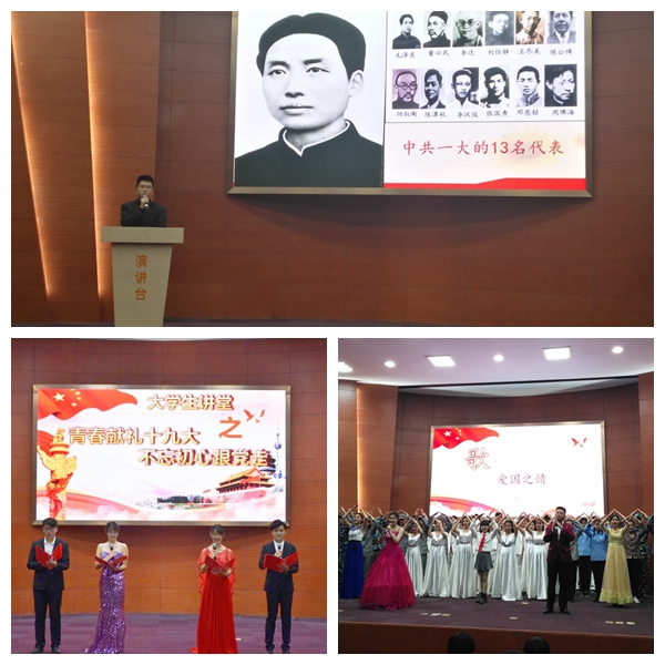 “没有共产党,就没有新中国”,大学生讲堂系列活动在激昂的旋律中拉开了帷幕。单人演讲《不忘初心、砥砺前行的中国共产党》,带领大家回顾了中国共产党成立96年来团结带领中国人民所走过的波澜壮阔的历史进程和作出的伟大历史贡献;随后,心声组合为同学们带来了乐器合奏《映山红》,悠扬的旋律直达同学们的内心,赢得了阵阵掌声;年代音乐剧《不朽的军旗》完美诠释了革命军队与百姓之间的深厚感情;中场环节,进行了十九大相关知识问答,在场同学积极发言,活跃了全场气氛;小品《地铁故事2》以幽默诙谐的方式演绎出令人深思的社会现实问题,传递了正能量,弘扬了社会主义核心价值观;集体朗诵《让我们放歌十九大》抒发了当代青年的爱国热情,令在场师生为之动容;最后,晚会在激昂的大合唱《国家》中落下帷幕。
