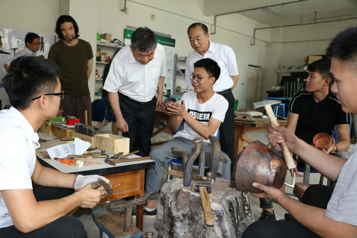 会后,郁章玉、朱松涛在应用型人才培养基地和有关部门、系负责同志陪同下到美术系金属、陶土实训室察看了实践教学情况,饶有兴趣地观看了实训室作品展。