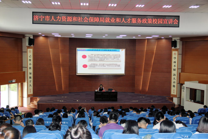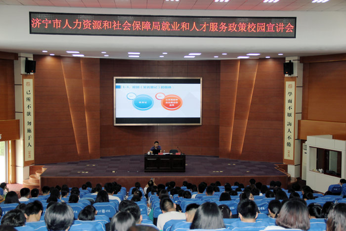 6月9日,济宁市人力资源和社会保障局就业和人才服务政策宣讲会在我校理科楼报告厅举行。