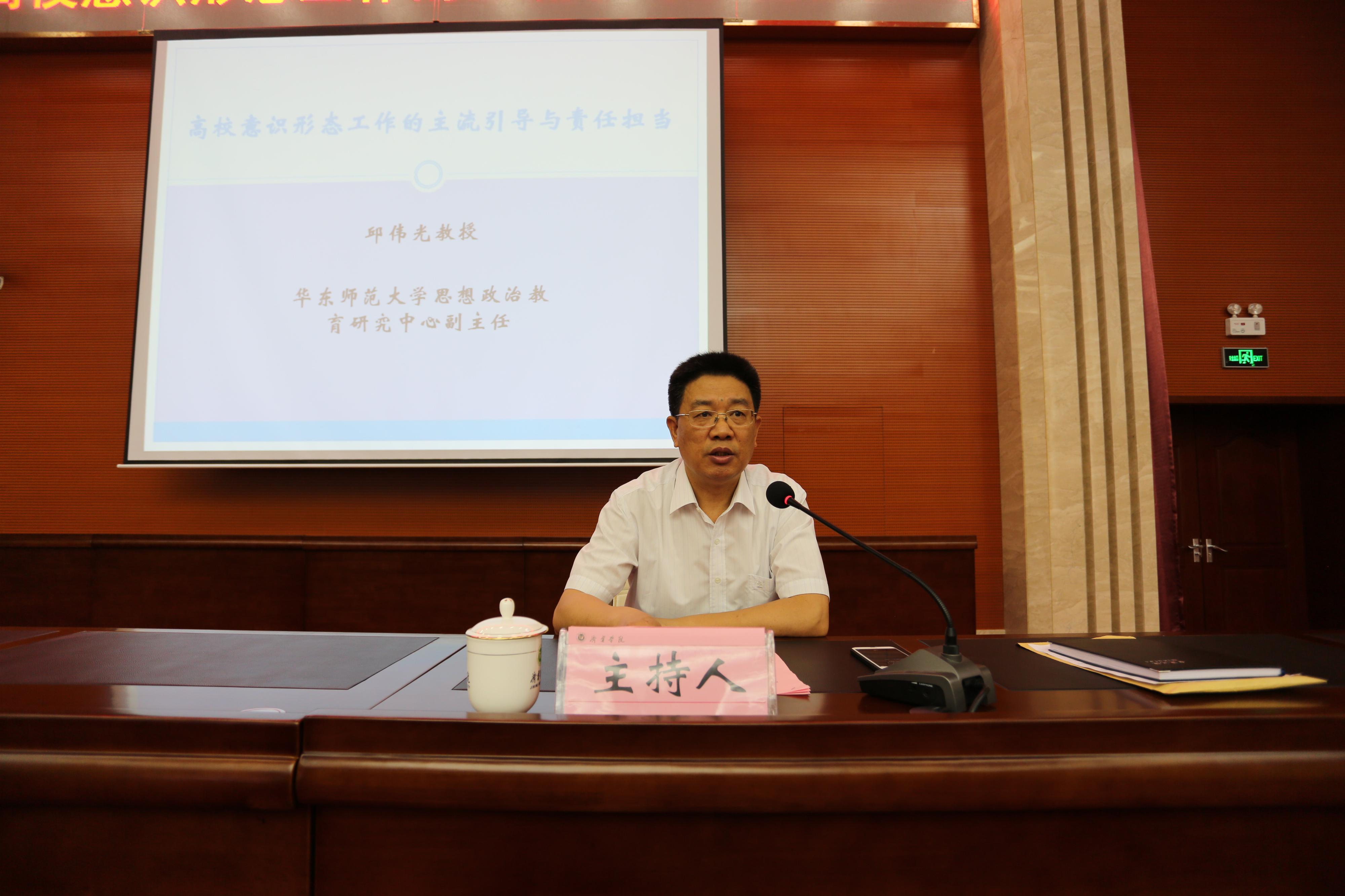 为深入学习贯彻全国全省高校思想政治工作会议精神,贯彻落实习近平总书记视察曲阜时的重要讲话精神,落实立德树人根本任务,6月9日上午,学校在科技文化大楼学术报告厅举办了意识形态工作专题报告会。华东师范大学思想政治教育研究中心副主任、博士生导师邱伟光教授应邀来校作了题为《高校意识形态工作的主流引导与责任担当》的报告。这也是我校“明德讲堂”第3讲。校党委书记郁章玉,党委副书记马恩,党委委员、纪委书记许记中,党委委员、副院长李继凯等校领导出席报告会。党务干部培训班的全体人员、各党总支(党委)书记和副书记、党支部书记、团总支书记、全体辅导员、党群部门科级以上干部共200多人聆听了报告。报告会由马恩主持。