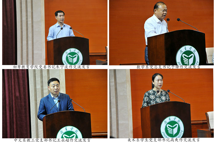 会上,中文系教工党支部书记王永超、美术系学生党支部书记高爽、数学系党总支书记于锋、初等教育学院党委书记朱宁波先后结合“两学一做”学习教育开展情况作了交流发言。