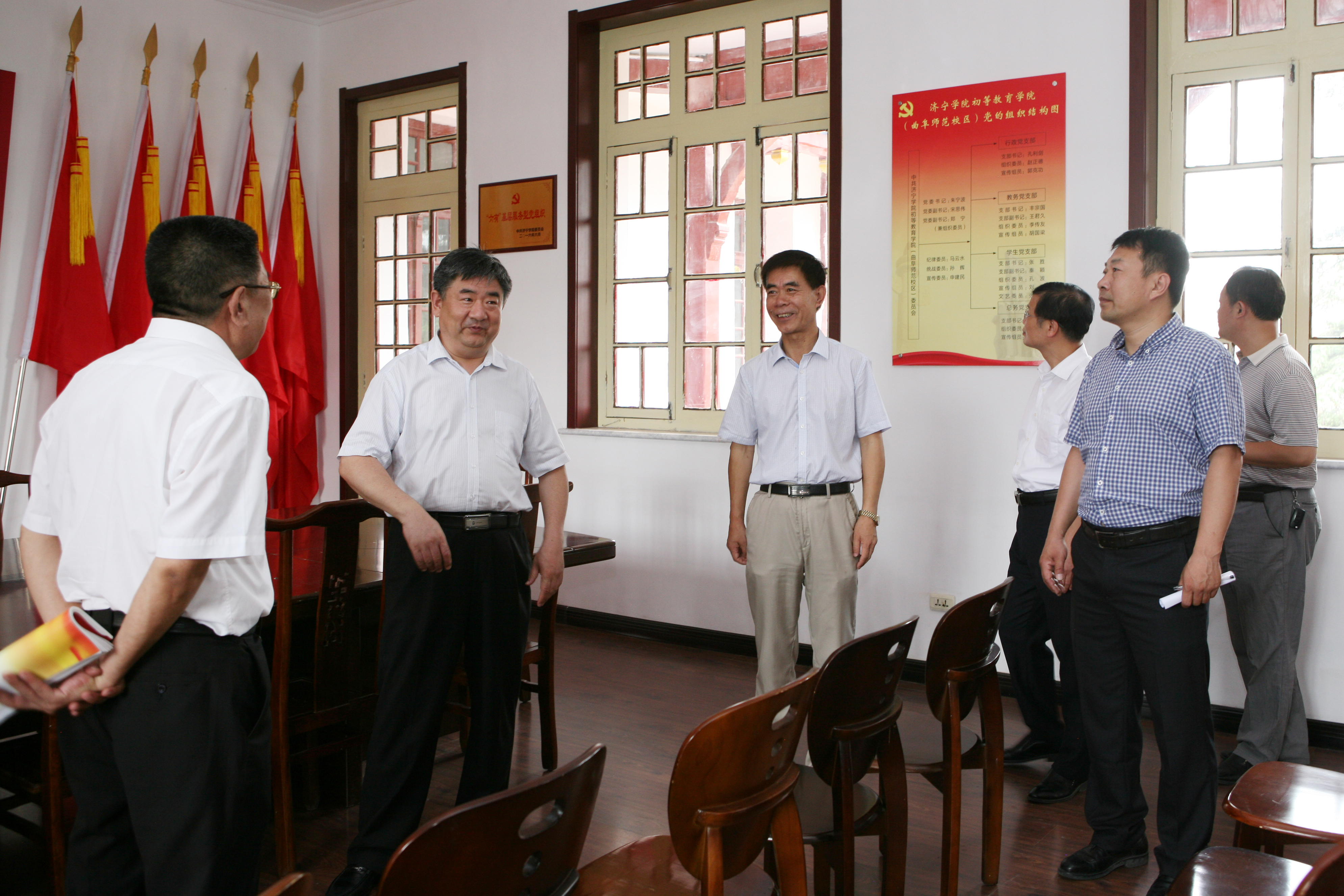 7月7日上午,校党委书记郁章玉以普通党员身份参加了所在组织部党支部与宣传部党支部联合开展的“两学一做”主题实践活动,并调研初等教育学院“六有”基层党组织建设。两个党支部的全体党员参加了此项活动。