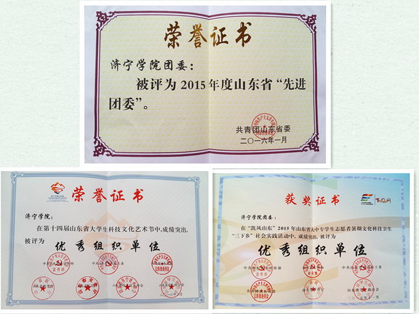 近日,共青团山东省委下发文件对全省共青团组织2015年度多项工作情况进行表彰。我校团委被评为2015年度山东省“先进团委”,同时荣获2015年山东省大中专学生志愿者暑期“三下乡”社会实践活动优秀组织单位和第十四届山东省大学生科技文化艺术节优秀组织单位称号。在第七届“调研山东”大学生社会调查活动中,我校师生也取得优异成绩,报送的《大学毕业生“回炉”培训热现象的调研》获全省二等奖,张静老师并评为优秀指导教师。(团委)