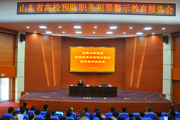 11月18日上午,由省委高校工委与省检察院共同组织开展的省属本科高校预防职务犯罪警示教育巡回宣讲活动,在我校理科楼报告厅举行。宣讲团由山东省人民检察院职务犯罪预防处处长秦喜迎、副处长王德海率领,学校党委书记郁章玉、院长吕灵昌出席宣讲活动,报告会由纪委书记许记中主持。