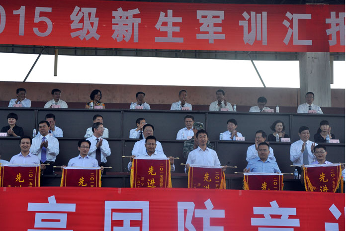 9月23日上午,2015级新生军训汇报总结大会在东运动场举行。校党委副书记、院长吕灵昌,党委委员、副院长刘德胜、张德芳,党委委员、纪委书记许记中,中国人民解放军 71770 部队上尉金松出席大会。大会由学工部部长、团委书记李凡路主持。