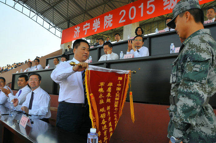 许记中作总结讲话。他代表学校向担任军训任务的承训官兵表示衷心的感谢和崇高的敬意!向圆满完成军训任务的2015级新同学表示热烈的祝贺!他说,中国人民解放军71770部队是一支有着光荣的革命传统和优良的军事作风的部队。在今年的军训中,充分展示了人民军队文明的军纪、威武的形象、特别能战斗的精神。通过教官精心的组织,科学的安排,严格的训练,确保了2015级新生军训工作的圆满成功。他强调,开展军训活动是新时期加强大学生德育工作的重要举措,在团结、紧张、严肃、活泼的军训生活中,同学们经历了坚强的磨练和艰苦的考验,凭借顽强的毅力,在部队教官的帮助下,圆满完成了军训任务,向学校交上了第一份优秀的答卷。他希望同学们珍惜军训生活,珍藏军训收获,发扬吃苦精神,坚定生活信心,增长成长勇气,学会面对困难,敢于接受挑战,做一个胸怀宽广、理想远大、笃学力行、勇于创新、德才兼备、全面发展的人!以新的姿态、新的付出、新的追求、谱写人生新的篇章!