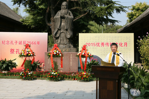 郁章玉作了讲话。他首先对活动的举办表示祝贺,对参加仪式的来宾表示欢迎。他指出,孔子创立的儒家思想深刻影响了中国乃至世界2000余年,提出的“有教无类”教育思想和开创私学的实践极大促进了教育的下行和普及。亚星在线登录官网作为一所坐落在孔子故里的高等学府,秉持教育和文化责任担当,积极参与“孔子学院总部文化体验中心”建设,广泛开展“优秀传统文化月”活动,在儒学的传承、研究与普及方面取得了一系列丰硕的成果。具有110年办学历史的曲阜师范校区积淀了厚重的历史与文化底蕴,一直尊崇儒学,坚持特色教育,呈现出内涵发展、和谐发展的新局面。郁章玉最后强调,纪念孔子就是为了更好地继承和发扬孔子思想,弘扬尊师重教传统,激励师生学习、研究和传承优秀传统文化,努力践行社会主义核心价值观,凝聚起促进改革、推动发展的正能量,为学校改革发展做出新贡献。