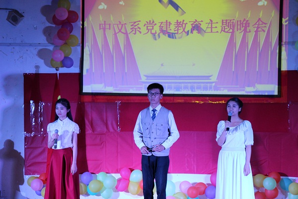 为庆祝中国共产党成立94周年, 中国人民抗日战争暨世界反法西斯战争胜利70周年, 6月24日晚,中文系举办了“光辉的历程,永恒的丰碑”党建教育主题晚会。校党委书记郁章玉,党委委员、副院长朱松涛出席晚会,组织部、宣传部、学工处、教务处、团委及中文系负责人参加了晚会。