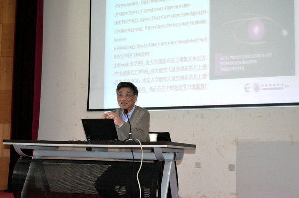 4月21日,应曲阜师范大学和我校邀请,中科院院士、南京大学博士生导师祝世宁教授来我校访问,党委书记郁章玉教授亲切会见了祝世宁,并向他介绍了学校在学科建设等方面的发展。下午,祝世宁院士在理科楼报告厅做了题为“小芯片上演绎大宇宙——从科幻大片《星际穿越》谈起”的学术报告。祝院士通过美国著名科幻影片《星际穿越》,用浅显易懂的语言和生动的图片介绍了时空弯曲、黑洞、虫洞、平行宇宙等天体物理中的概念,并详细阐述了祝院士课题组近期在光子芯片上模拟天体物理中时空弯曲,验证爱因斯坦广义相对论方面所取得的成果。祝院士平易近人、学识渊博、讲解问题深入浅出,带领师生们进行了一次深度科学探索之旅,更使整场报告会气氛活跃,不时引起师生们热烈的掌声。
