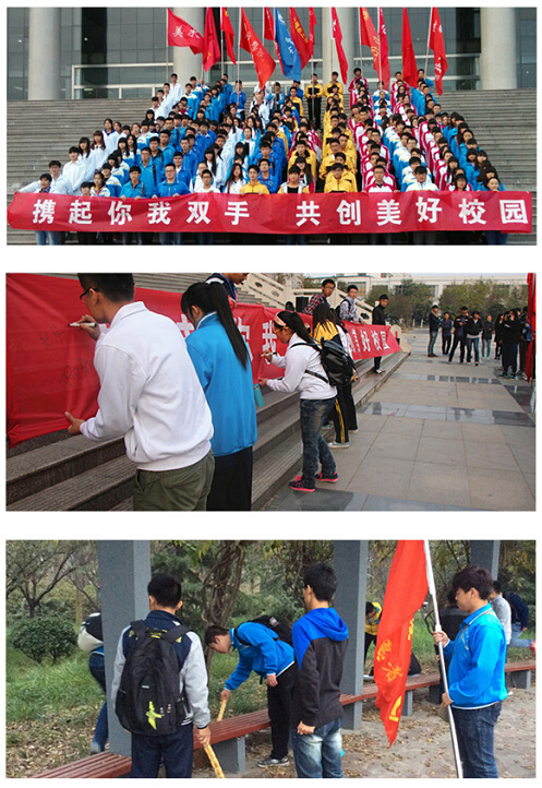 活动开始前,校团委老师作动员,鼓励同学们要秉承志愿者精神,发挥志愿者作用,从小事做起,从细节做起,带动身边的同学,共同建设和谐美好的校园。校学生会干部宣读《创建文明 举手之劳倡议书》,到场人员在活动条幅上签下自己的名字。随后,各系志愿者们开展了美化、净化校园活动,通过实际行动倡导校园文明。