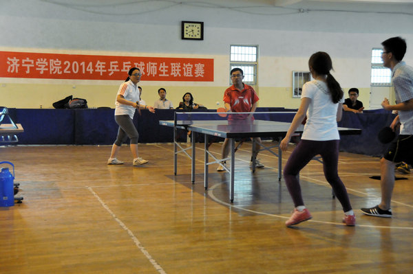 5月27日下午,我校2014年乒乓球师生联谊赛在体育系篮球馆举行。比赛以团体赛形式进行,各自选手均随机产生,每场比赛采取为五局三胜制。每场比赛竞争都非常激烈,有的以巧攻见长,有的以快打慢,还有的以不变应万变,每轮比赛都是一次实力的碰撞,是一次自我的挑战,也是一次情感的交流。