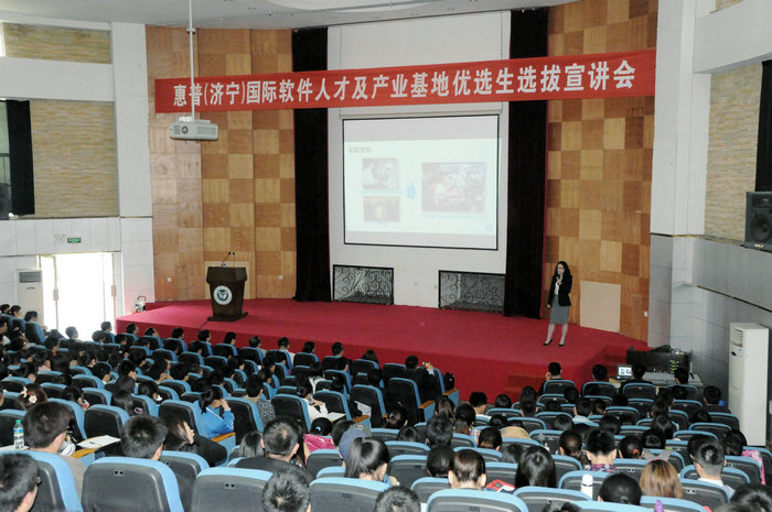 近日,惠普(济宁)国际软件人才及产业基地与15所合作高校的首场优选生选拔宣讲会在我校举行。副院长朱松涛出席并讲话。惠普(济宁)国际软件人才及产业基地王福刚校长、惠普国际软件部项目总监王滢及大区经理韩冰等9位高管,以及我校教务处、学生处、计算机科学系、数学系、物理系等单位负责人和500多名学生参加了宣讲会。宣讲会由惠普驻校代表熊威女士主持。