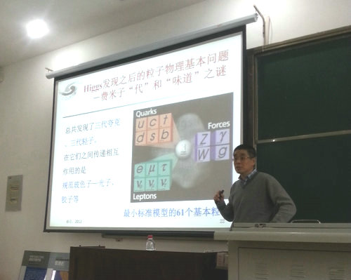 近日,中国科学院高能物理研究所吕才典研究员应邀来到我校进行学术交流,并在理科楼D101多媒体教室为相关专业本科生作了一场题为“Higgs粒子与粒子物理标准模型”的学术报告。报告中,吕才典研究员从今年的诺贝尔物理学奖讲起,向大家介绍了“上帝粒子”——Higgs粒子的实验发现过程和相关研究的最新进展,并对粒子物理学今后的发展方向进行了展望。