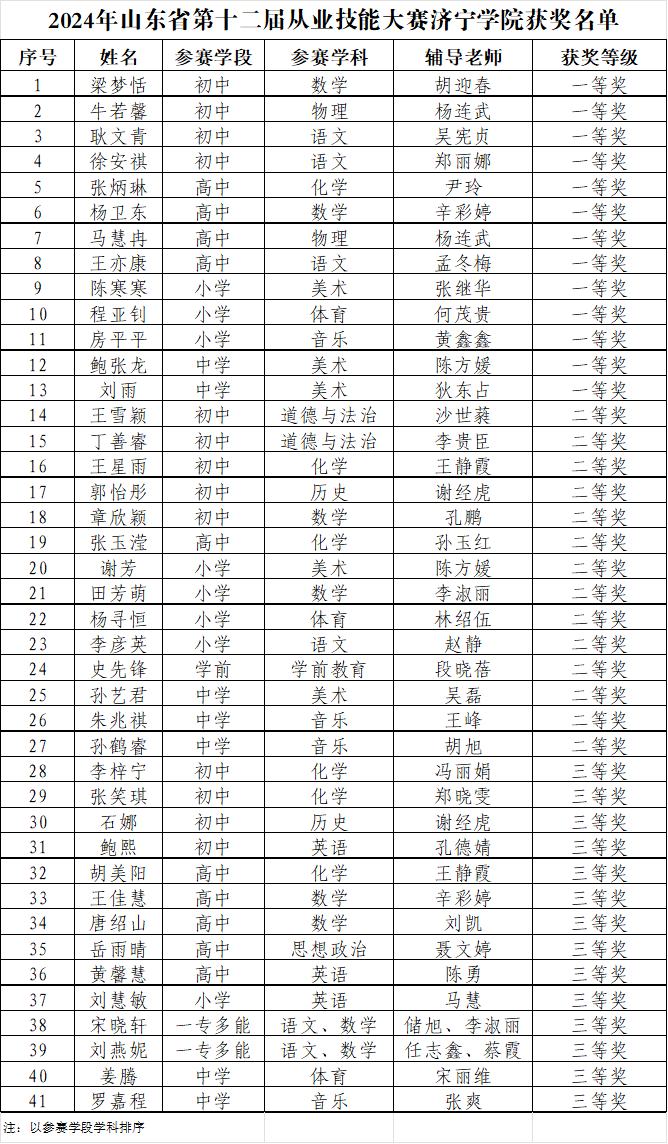 7月17日至7月21日,第十二届山东省师范类高校学生从业技能大赛省级决赛普通学科比赛在鲁东大学圆满落幕,共有来自全省62所高校的805名选手参加。合并7月初在淄博师专落幕的音乐体育美术学科省级决赛成绩,我校在本届大赛中喜获佳绩,获奖层次和人数创历史新高,学校首次获得团体铜奖,并获得优秀组织奖,程亚钊等13位同学获得一等奖,丁善睿等14位同学获得二等奖,李梓宁等14位同学获得三等奖;孟冬梅等12位教师获省级优秀辅导教师荣誉称号。