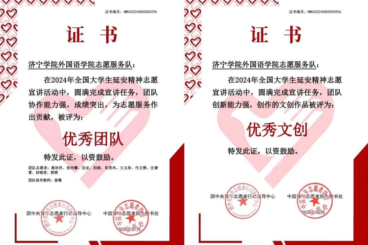 近日,团中央青年志愿者行动指导中心、中国青年志愿者协会公布了2024年全国大学生延安精神志愿宣讲团优秀团队名单, 我校外国语学院志愿服务队从全国1000支队伍中脱颖而出,被评为全国优秀团队,团队创作的文创产品被评为全国优秀文创。
