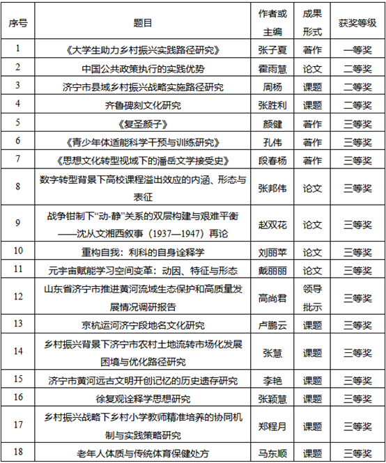 近日,济宁市社会科学优秀成果奖评选委员会根据《济宁市社会科学优秀成果奖评选办法》《济宁市社会科学优秀成果奖评选工作实施细则》等有关规定公布了济宁市第三十四次社会科学优秀成果奖评审结果,我校18项成果获得奖励,其中一等奖1项,二等奖3项,三等奖14项。