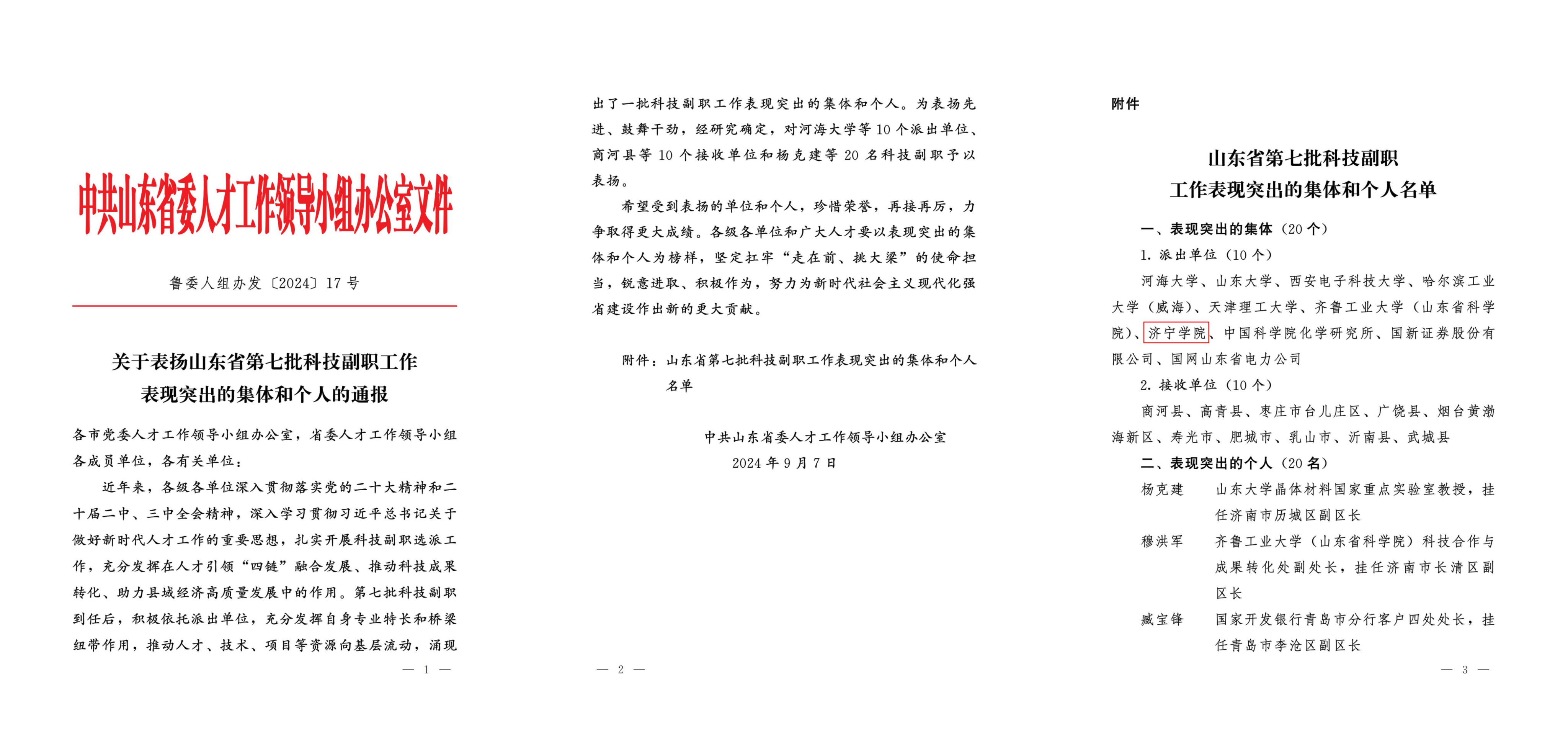 近日,省委人才工作领导小组办公室印发《关于表扬山东省第七批科技副职工作表现突出的集体和个人的通报》,对扎实开展科技副职选派工作表现突出、成绩优异的先进单位和个人进行表扬。我校被授予“全省第七批科技副职工作表现突出集体”称号。