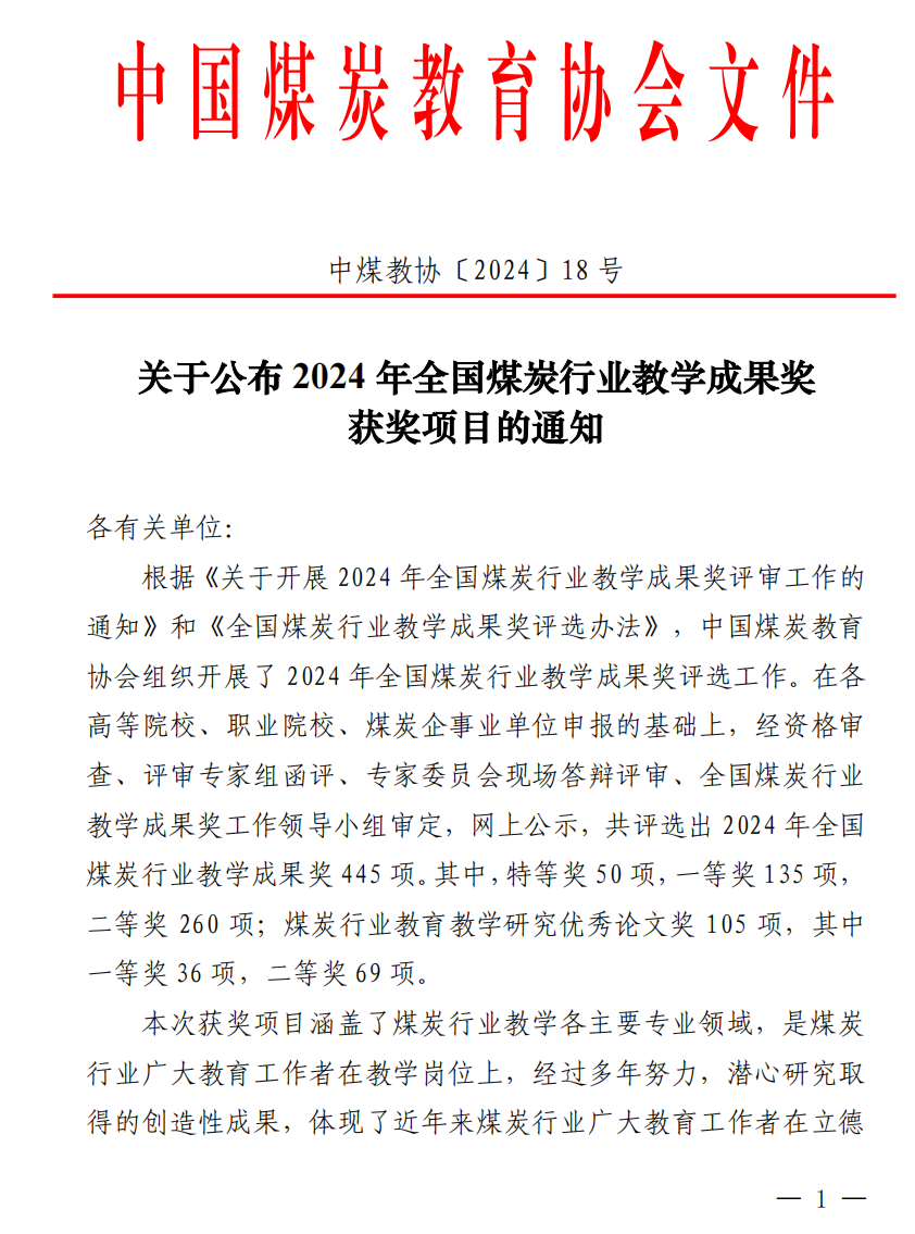 近日,中国煤炭教育协会发布了《2024年度全国煤炭行业教学成果奖获奖项目的通知》(中煤教协〔2024〕18号),我校资源环境与安全工程学院申报的《“四方联动,三维一体”地方高校安全工程应用型人才培养模式探索与实践》在高等教育类(本科)教学成果奖评选中荣获二等奖。
