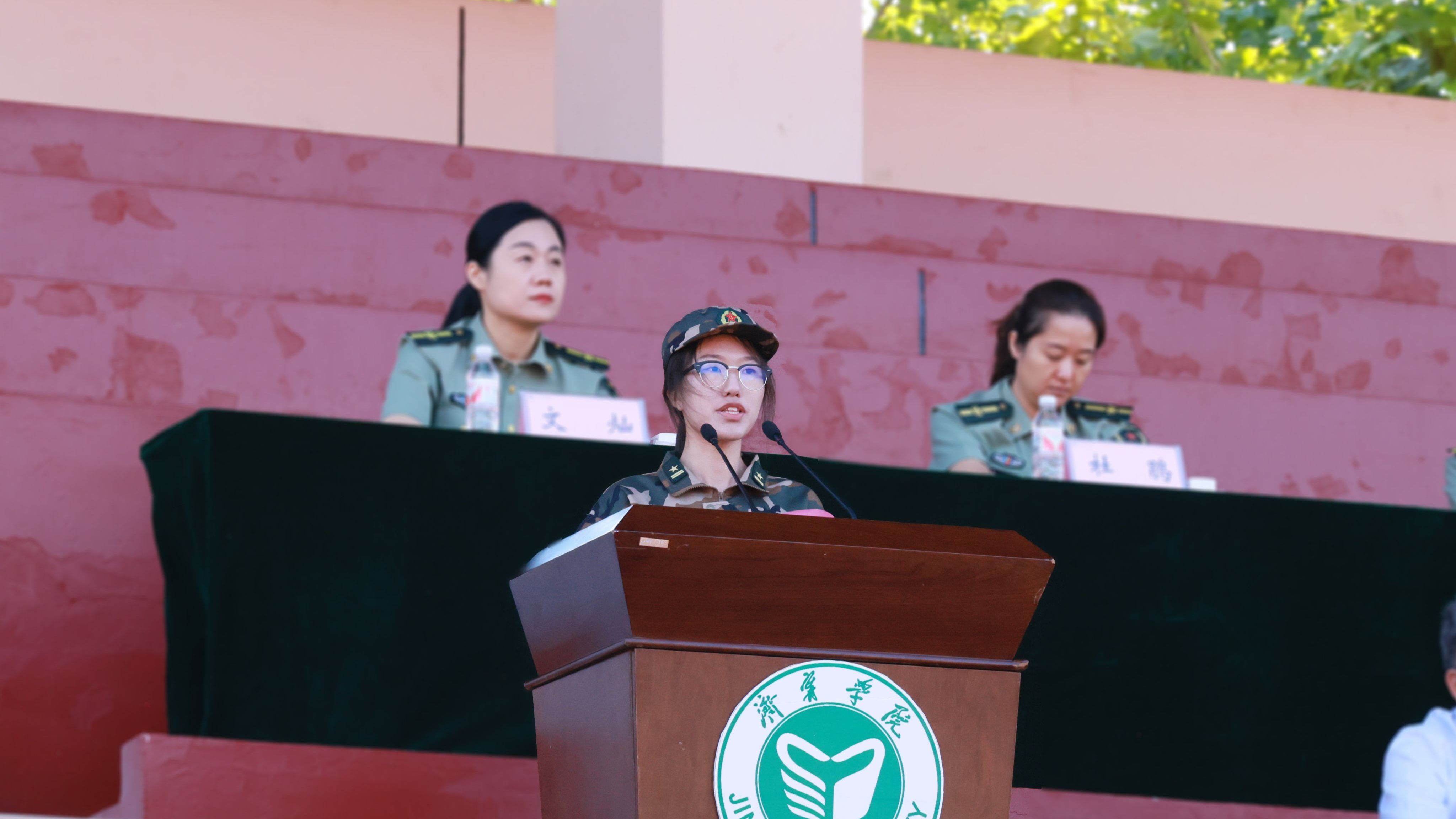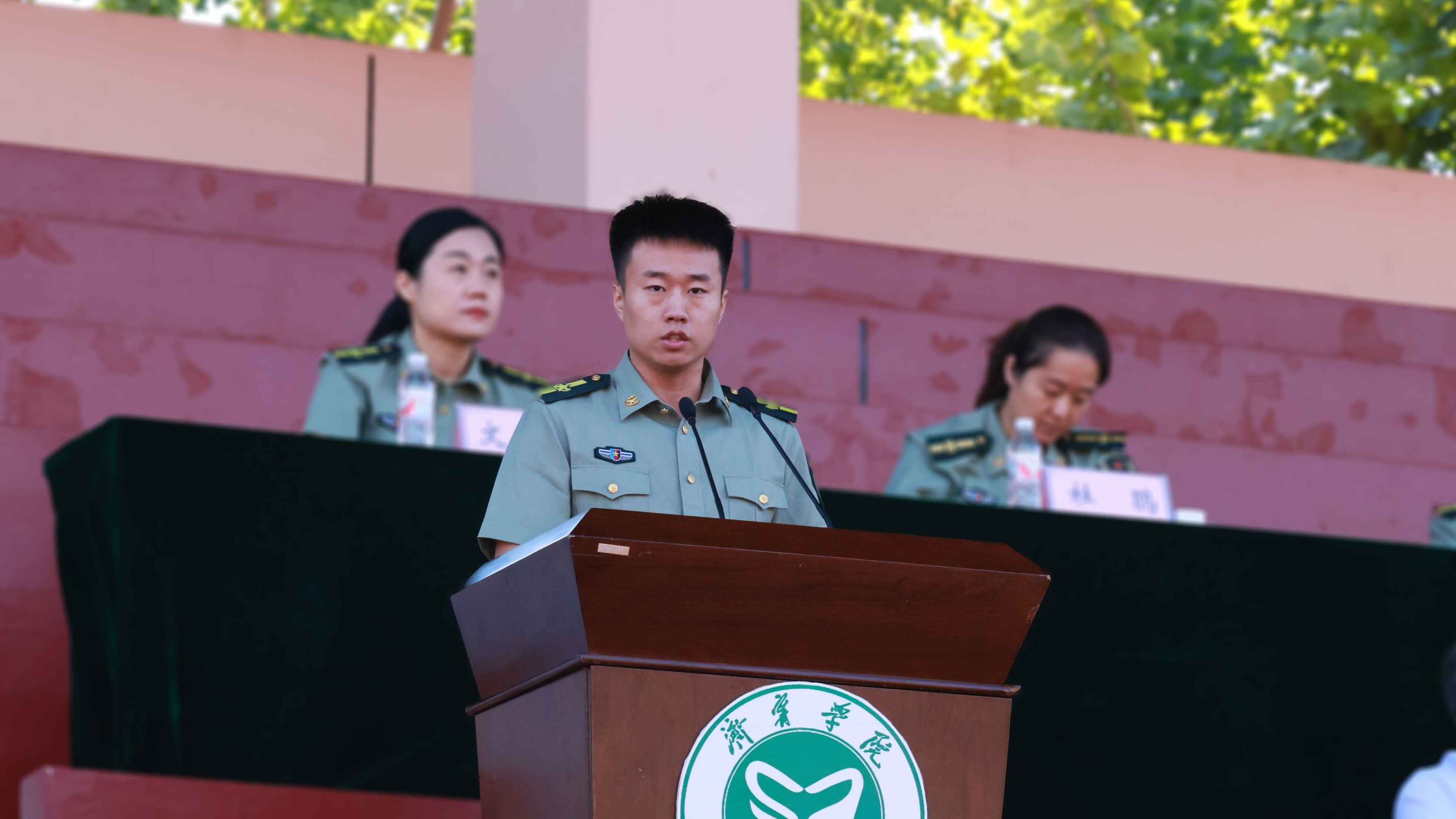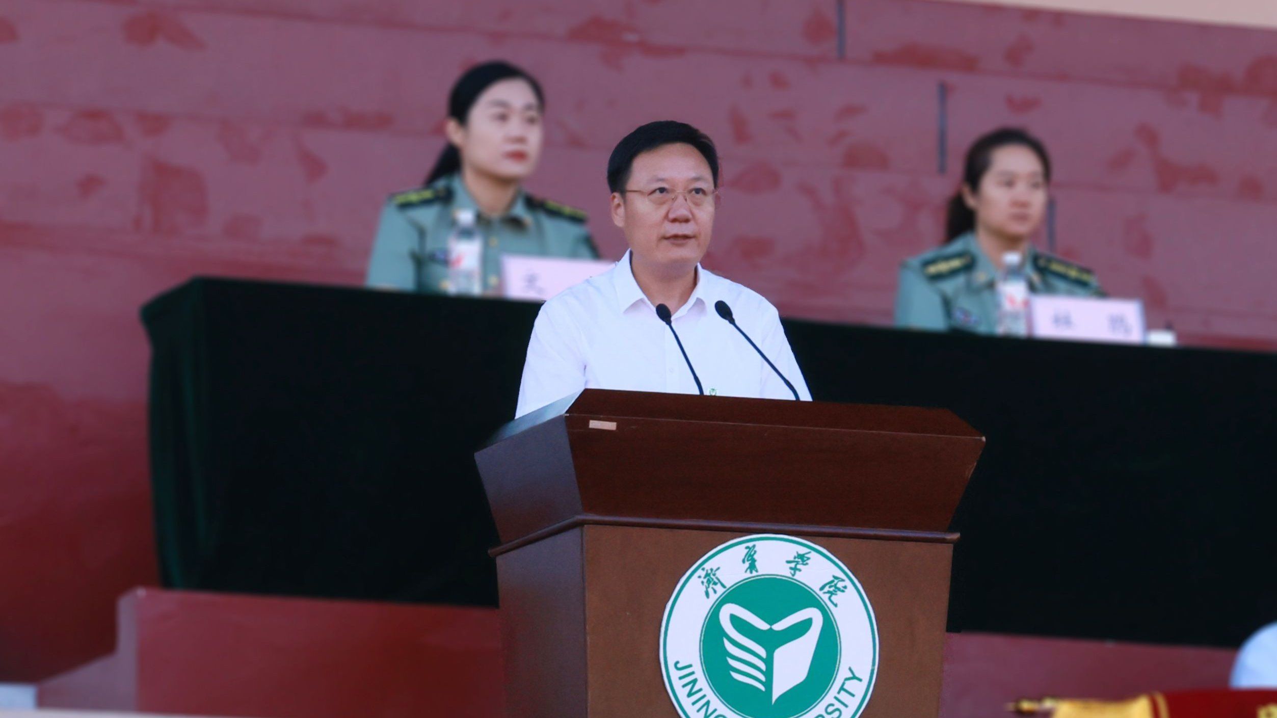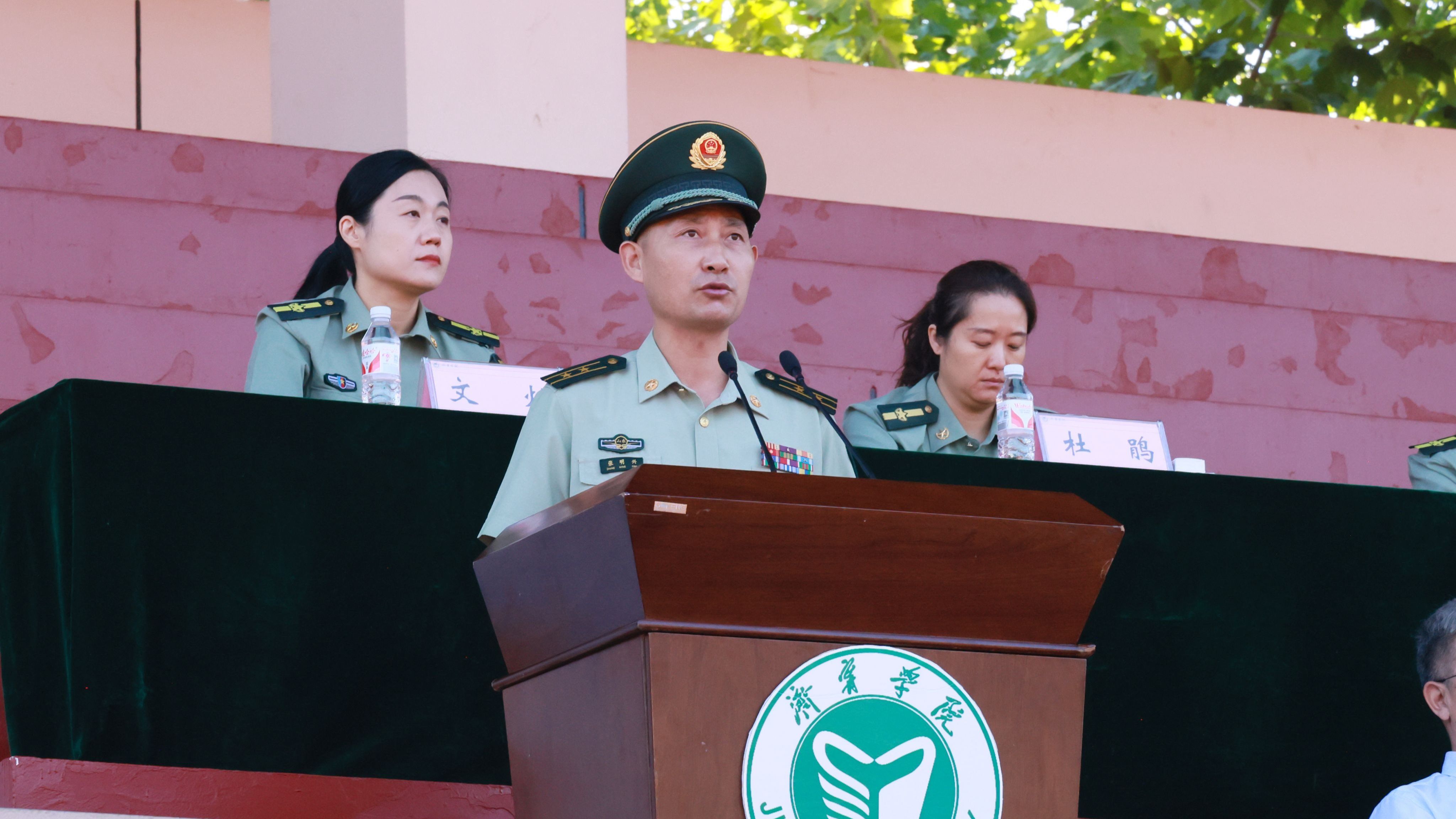 武警济宁支队领导张明兴讲话,他祝贺同学们顺利完成军训任务,希望同学们继续保持充足的干劲、十足的信心,把军训成果转化为努力学习、刻苦钻研的强大精神动力,发扬勇敢、坚毅、顽强、拼搏的军训精神,努力成为一名素质全面、作风扎实的好学生,用知识去建设国家,用智慧去支援国防建设,用行动去支持部队建设。