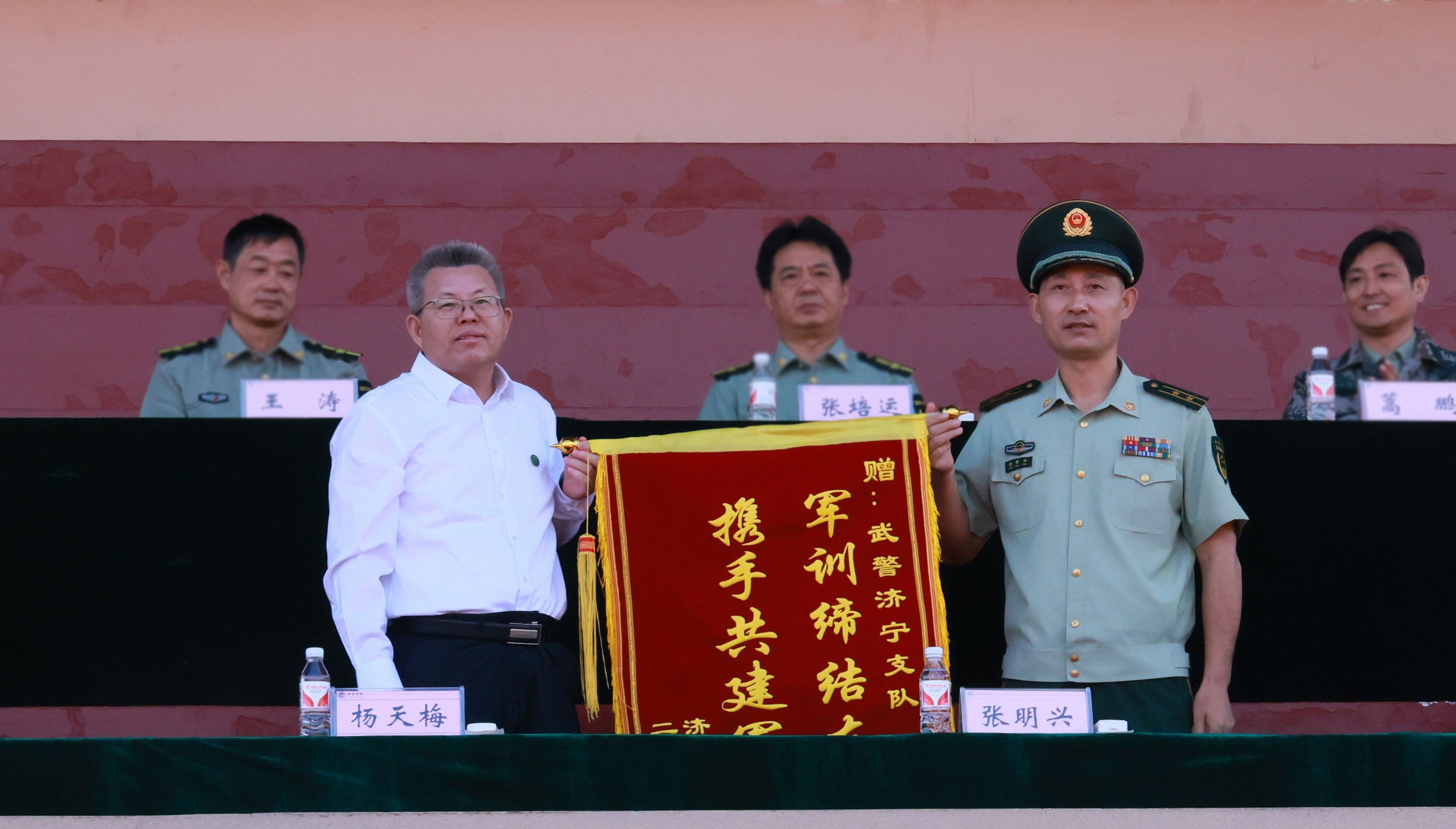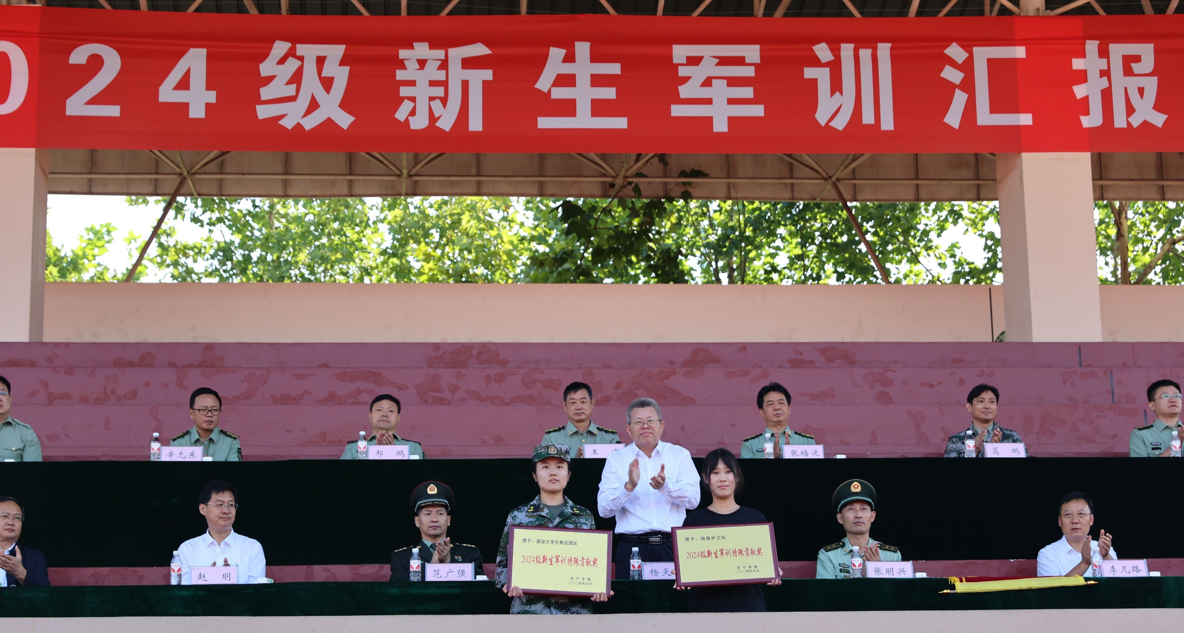 会上,杨天梅代表学校向武警济宁支队赠送锦旗,向退役大学生教官团队和国旗护卫队颁发特殊贡献奖。李凡路宣读了《关于表彰2024级新生军训先进营、优胜连和优秀学员的决定》。主席台领导为获奖先进集体和先进个人代表,颁发了奖牌和证书。