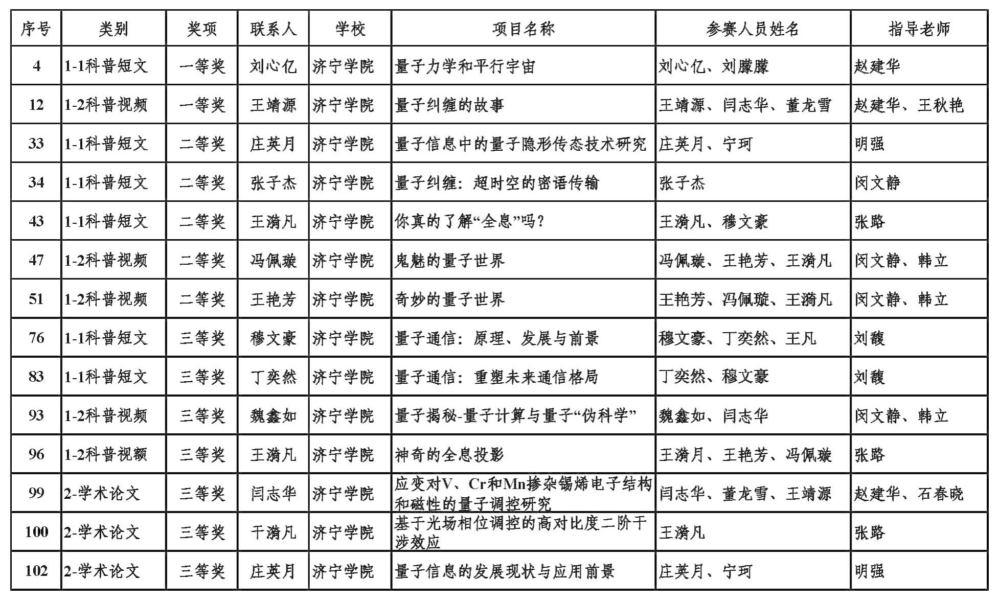 我校学生在比赛中充分展示了自己的创新能力和学术素养,营造了浓厚的学术氛围。在张路、闵文静等指导老师的精心指导下,经过对作品的精心准备、反复修改,参赛学生提高了自身的科研能力,对量子信息领域产生了浓厚的兴趣。
