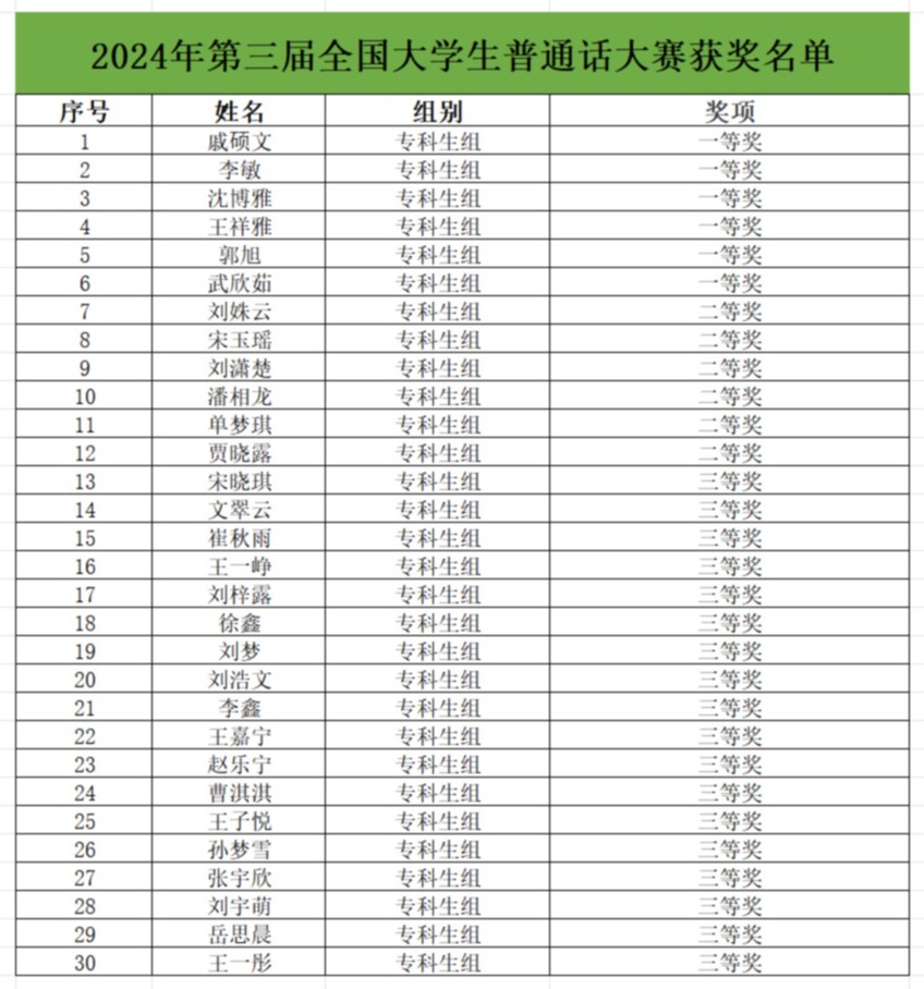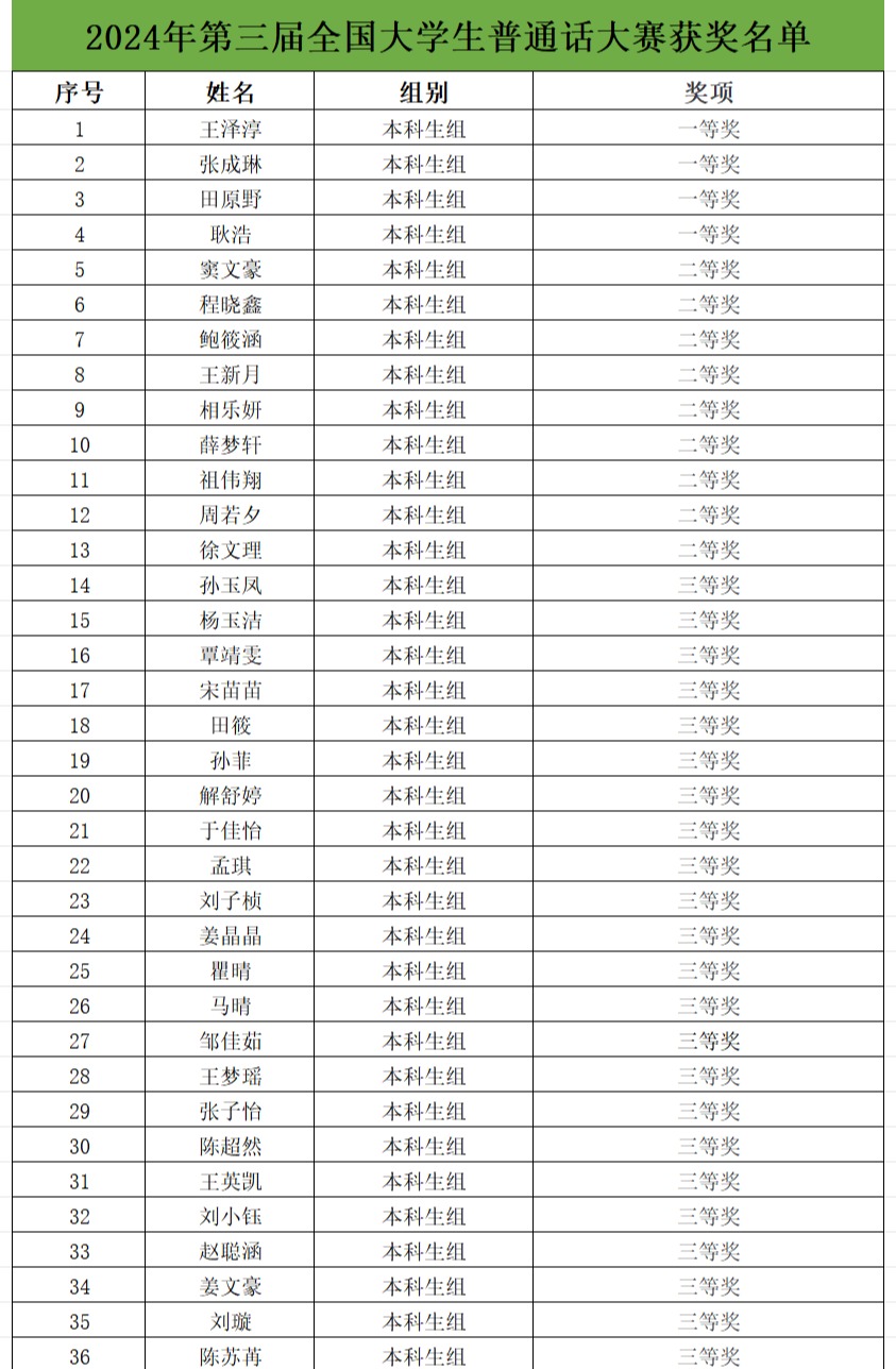 近日,由中国语文报刊协会读写教学分会主办的2024年第三届全国大学生普通话大赛决赛圆满落幕,我校人文与传播学院学生凭借扎实的语言功底,获得本科生组一等奖4名,二等奖9名,三等奖23名,专科生组一等奖6名,二等奖6名,三等奖18名。