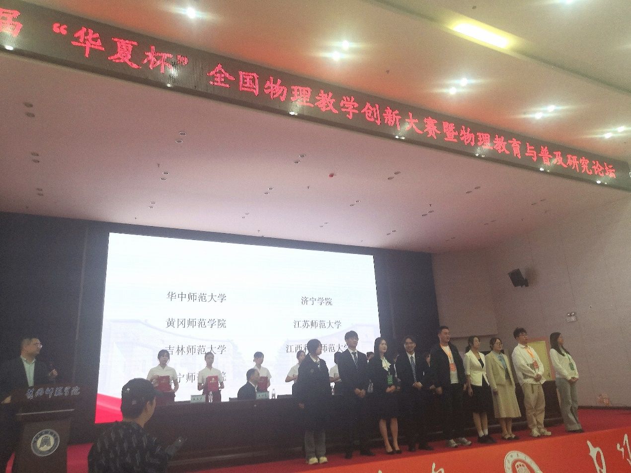 近日,第九届“华夏杯”全国物理教学创新大赛暨物理教育与普及研究论坛在黄冈师范学院举行,来自华东师范大学、西南大学等84所高校的750名优秀研究生、本科生同台竞技、各展风采。我校物理与电子工程学院共派出8位同学参赛,获教学创新一等奖1项、二等奖2项、三等奖3项,科普展演二等奖1项、三等奖1项。指导教师杨连武、赵建华受邀为教学创新组比赛的评审专家。