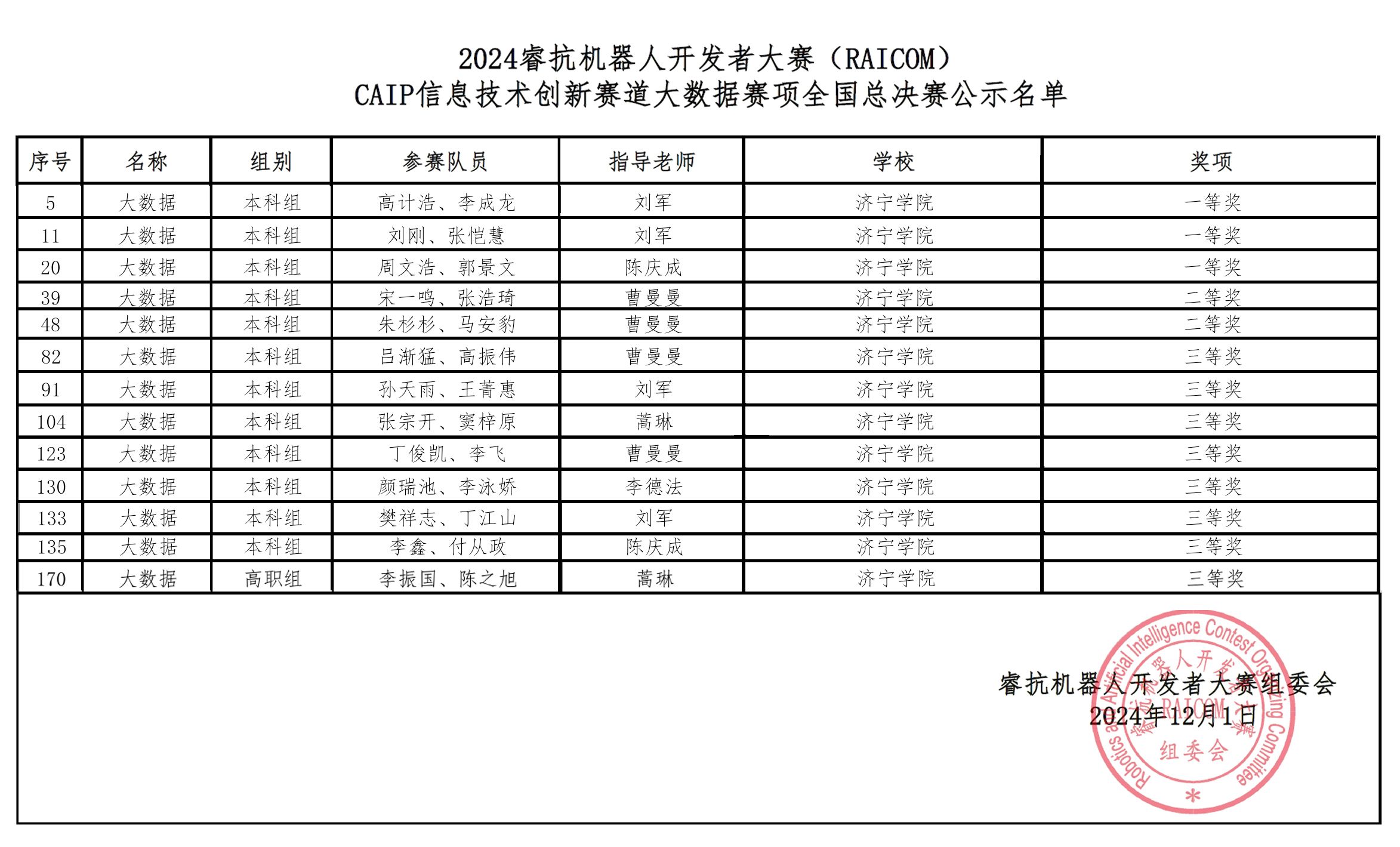 11月29日至30日,2024年睿抗机器人开发者大赛(RAICOM)CAIP信息技术创新赛道大数据赛项全国总决赛在河北工业职业技术大学举办,来自25个省,110所高校,1344支队伍经过省赛选拔最终71所院校,216支队伍进入全国总决赛展开精彩对决。12月1日,大赛公布获奖名单并举行了颁奖仪式,我校计算机科学与工程学院的12支本科队伍和1支专科队伍,表现优异榜上有名,共获得一等奖3项,二等奖2项,三等奖8项,获奖数量位居参赛院校前列。