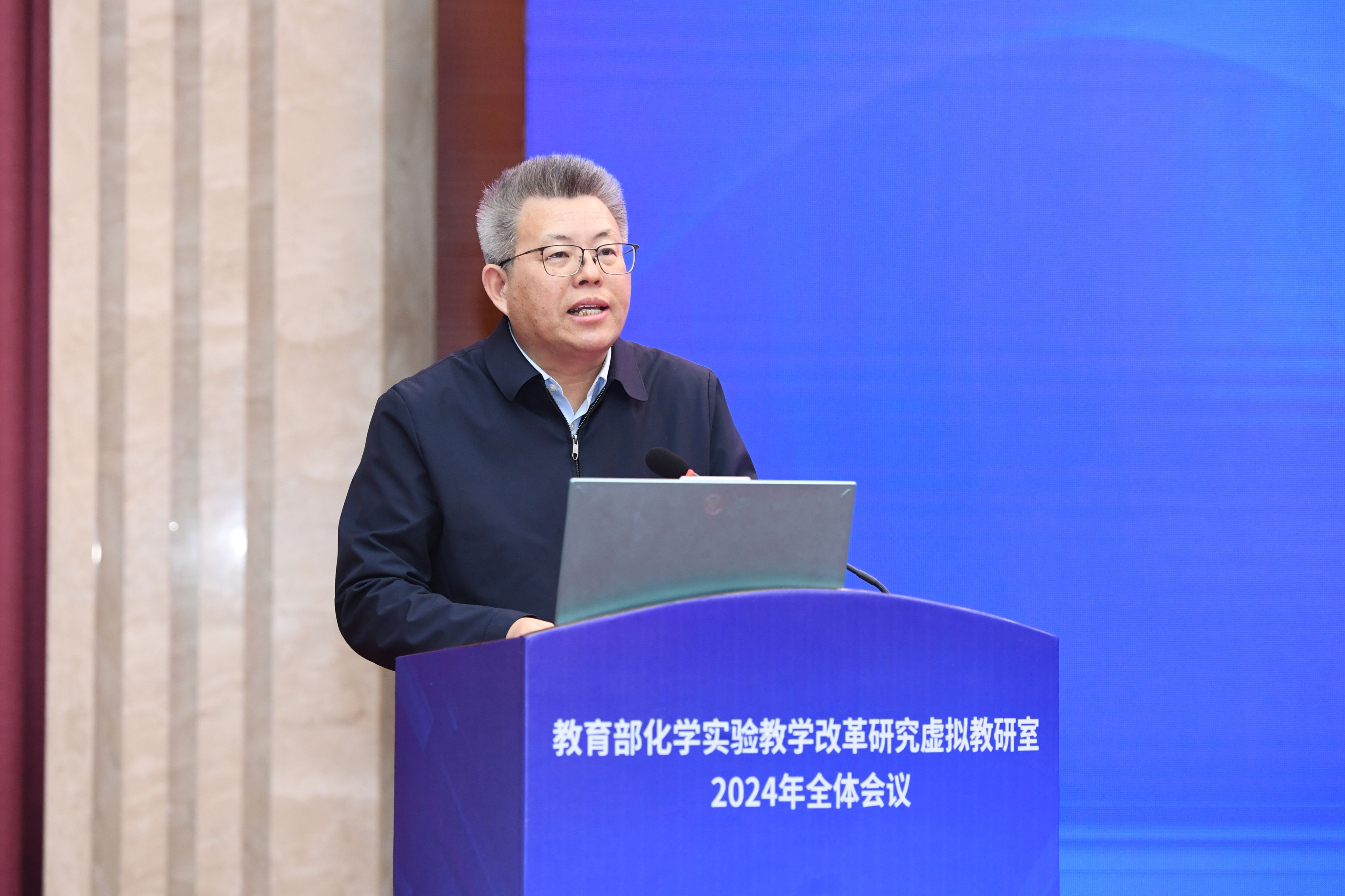 山东大学资产与实验管理部部长占金华教授代表山东大学致辞,他指出化学实验教学改革研究虚拟教研室自成立以来,搭建了全国性的交流平台,推动了实验教学理念、方法和技术的创新,并促进了课程内容的优化与整合。通过加强合作与探索新模式,虚拟教研室为高素质人才的培养和我国高等教育的科技创新做出了积极贡献。