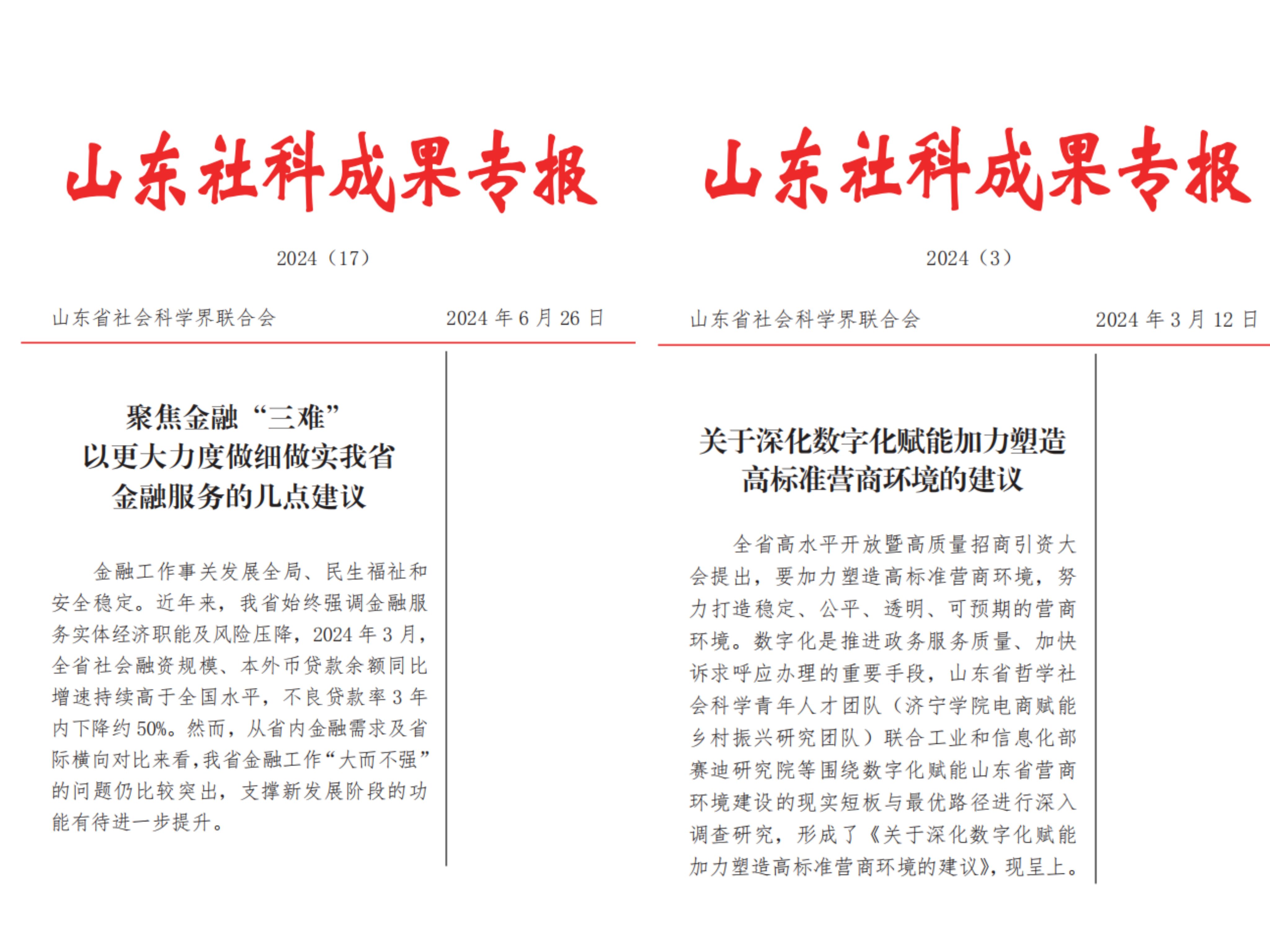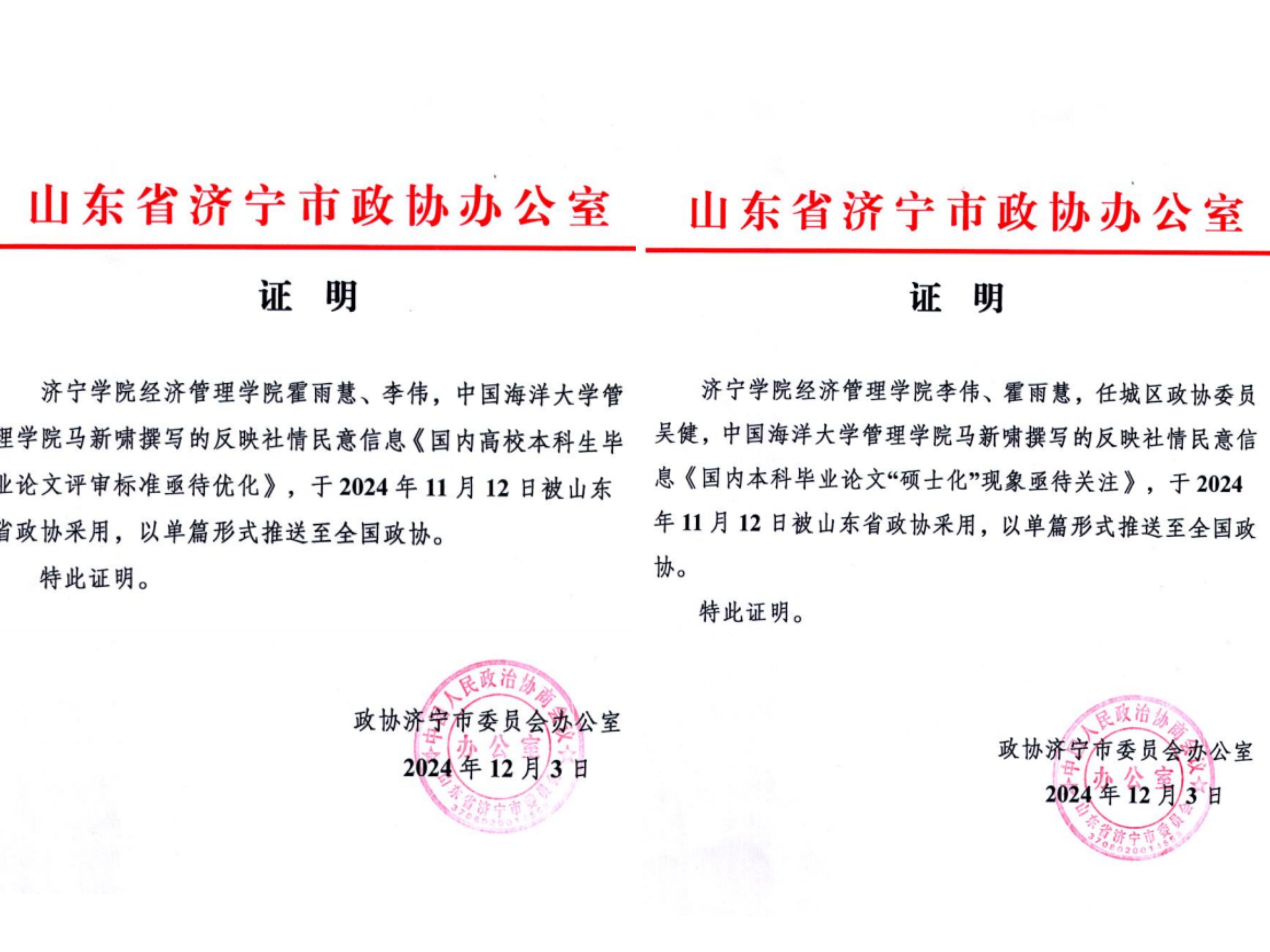 《关于深化数字化赋能加力塑造高标准营商环境的建议》(作者:霍雨慧、李伟)《打造山东省农村电商“齐鲁样板”的几点建议》(作者:霍雨慧、李伟)两篇获省级社科专报(《山东省社科专报》)采纳。《生成式人工智能背景下互联网宗教事务治理面临的挑战与对策》《我国二次元产业发展潜在的风险与对策建议》(作者:林林)被民革中央采纳。《我国高校本科生毕业论文(设计)工作亟待优化》(作者:霍雨慧、李伟、马新啸)《国内本科毕业论文“硕士化”现象亟待关注》(作者:李伟、霍雨慧、吴建、马新啸)被山东省政协采纳,以单篇形式推送至全国政协。