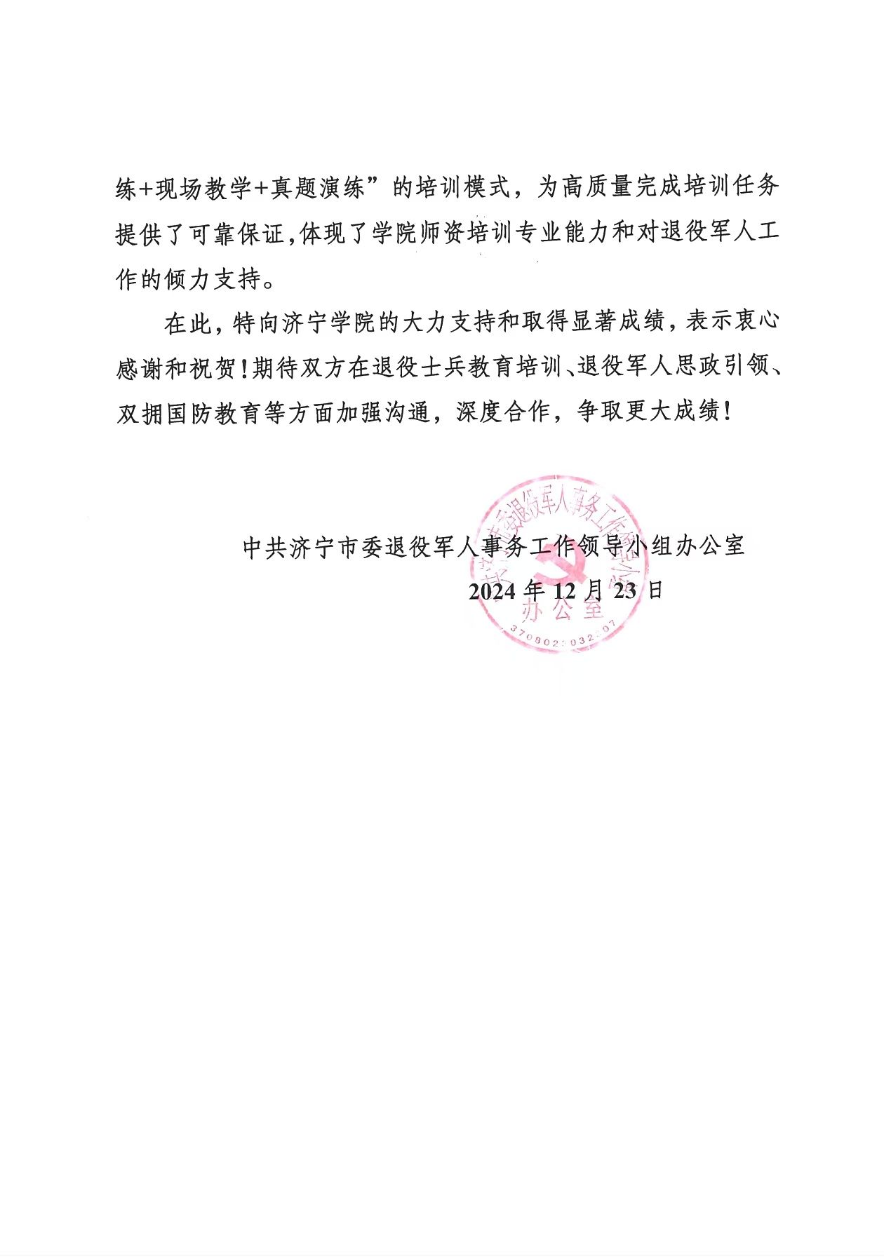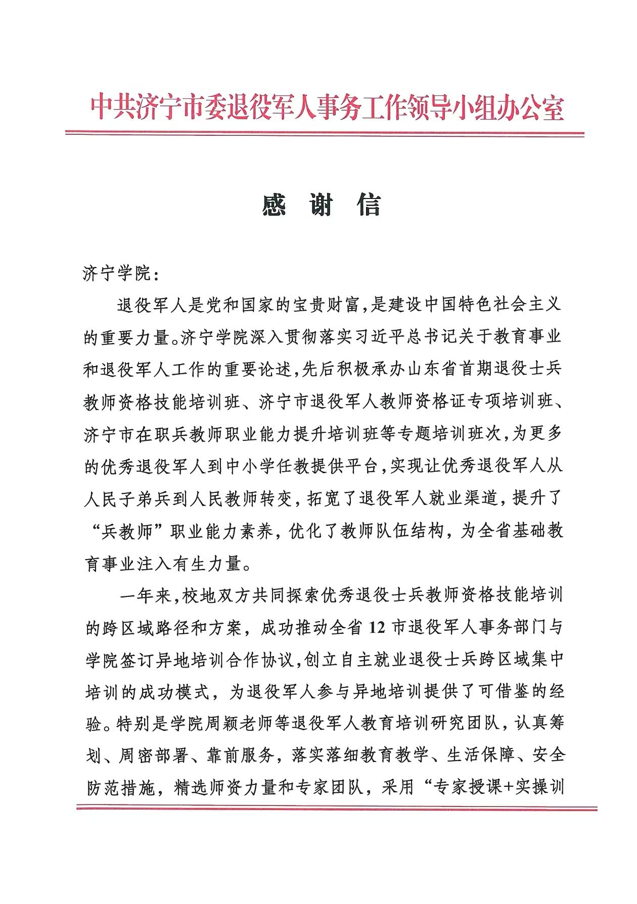 近日,中共济宁市委退役军人事务工作领导小组办公室向我校发来感谢信,对我校一直以来对退役军人教育培训工作的大力支持和取得的成绩表示感谢和祝贺!