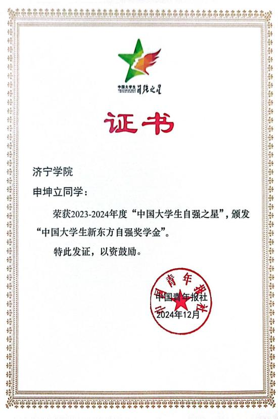 近日,由共青团中央、全国学联指导,团中央基层建设部、中国青年报社、新东方教育科技集团、中国青年创业就业基金会联合举办的2023—2024年度“中国大学生自强之星”奖学金评选结果揭晓,我校人文与传播学院学生申坤立在评选中脱颖而出,荣获2023—2024年度“中国大学生自强之星”荣誉称号,获颁“中国大学生新东方自强奖学金”。