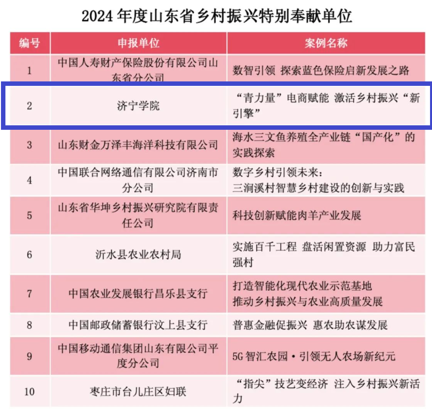 近日,由山东省农业农村厅(山东省乡村振兴局)、山东社会科学院指导,山东省乡村振兴研究会主办的“乡村振兴优秀案例”评选活动公布结果,我校经济管理学院报送的案例《“青力量”电商赋能 激活乡村振兴“新引擎”》从800余个申报案例中脱颖而出,成为入选的40个优秀案例之一,学校荣获“2024年度山东省乡村振兴特别奉献单位”。