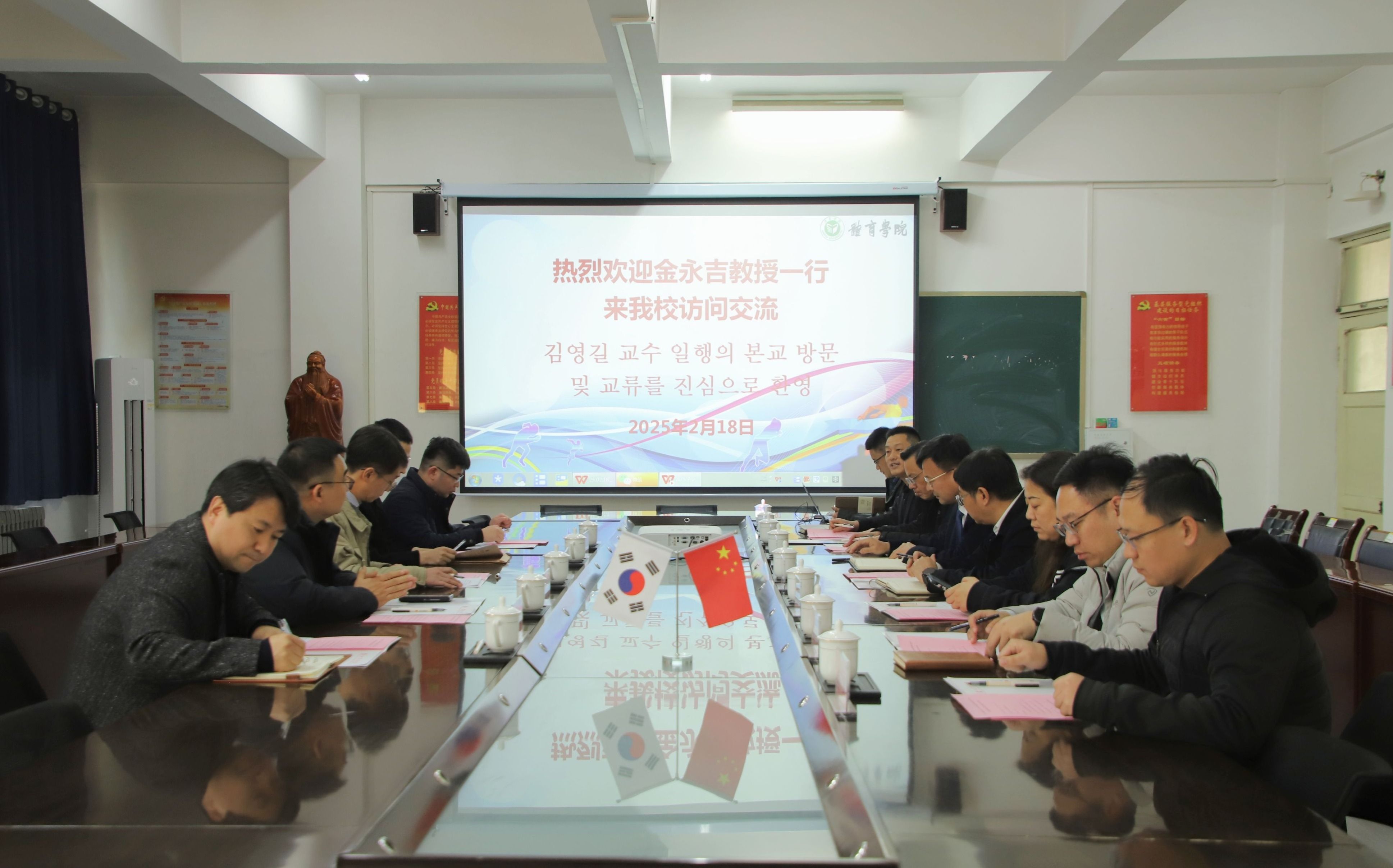 2月18日,韩国信韩大学未来技术创新研究所金永吉教授、北京学能通科技集团董事长孔凡德一行来我校访问交流。校党委委员、副校长尹春光会见客人,对金永吉教授一行来访表示热烈欢迎。体育学院、国际教育学院相关人员参加活动。
