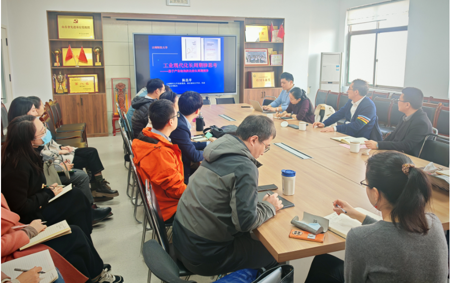 学术报告由副校长刘国栋主持。陈昆亭围绕“工业革命长周期律观察、初始工业化阶段的思想逻辑、后工业化阶段的周期律”展开,分享了他对经济增长的重要认识,他指出,长期经济增长归根于社会需求,建设长期稳定和注重长效机制的政策规则是长期稳定可持续发展的重要方面。报告结束后,陈昆亭与经济管理学院青年博士互动交流,提出了对增长理论的几个新方向供大家思考研究,对数字经济学科、团队建设等方面进行指导。