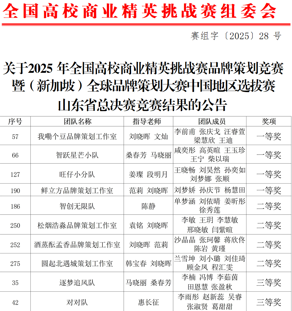 3月28日至30日,由中国国际贸易促进委员会商业行业委员会举办的2025年全国高校商业精英挑战赛品牌策划竞赛暨(新加坡)全球品牌策划大赛中国地区选拔赛山东省总决赛在潍坊理工学院成功举办。我校派出的10支参赛队伍表现优异,共获得省级一等奖4项、二等奖4项、三等奖2项,展现了我校学子扎实的专业素养和卓越的团队协作能力。