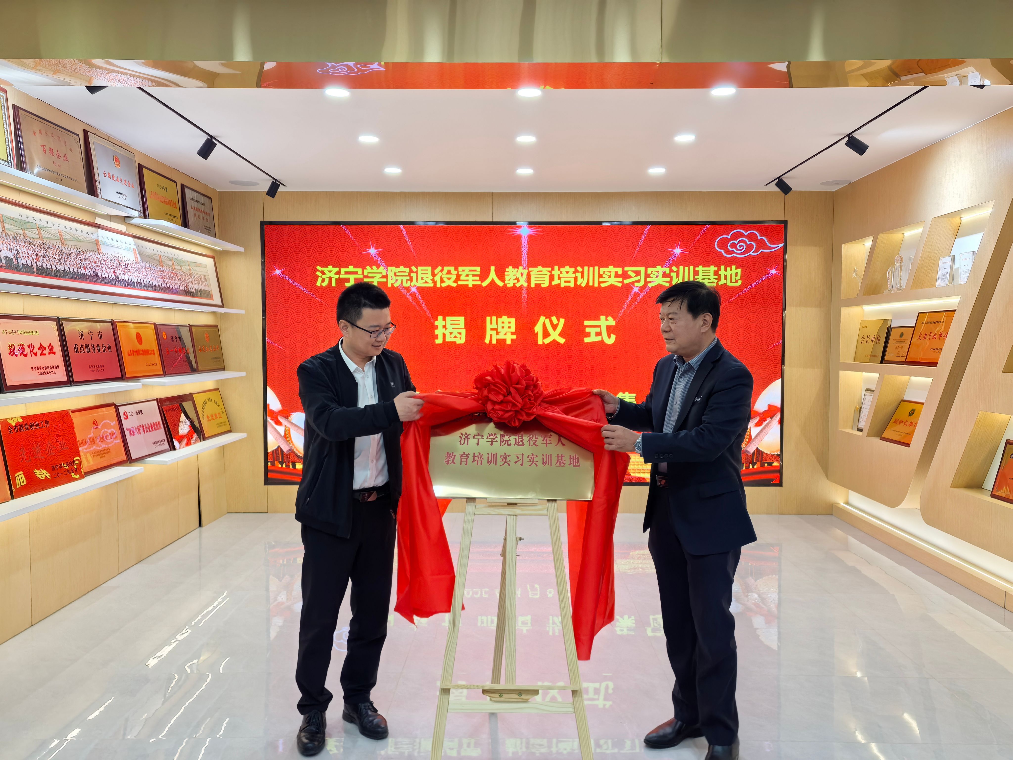 刘国栋与张建波共同为“亚星在线登录官网退役军人教育培训实习实训基地”揭牌。