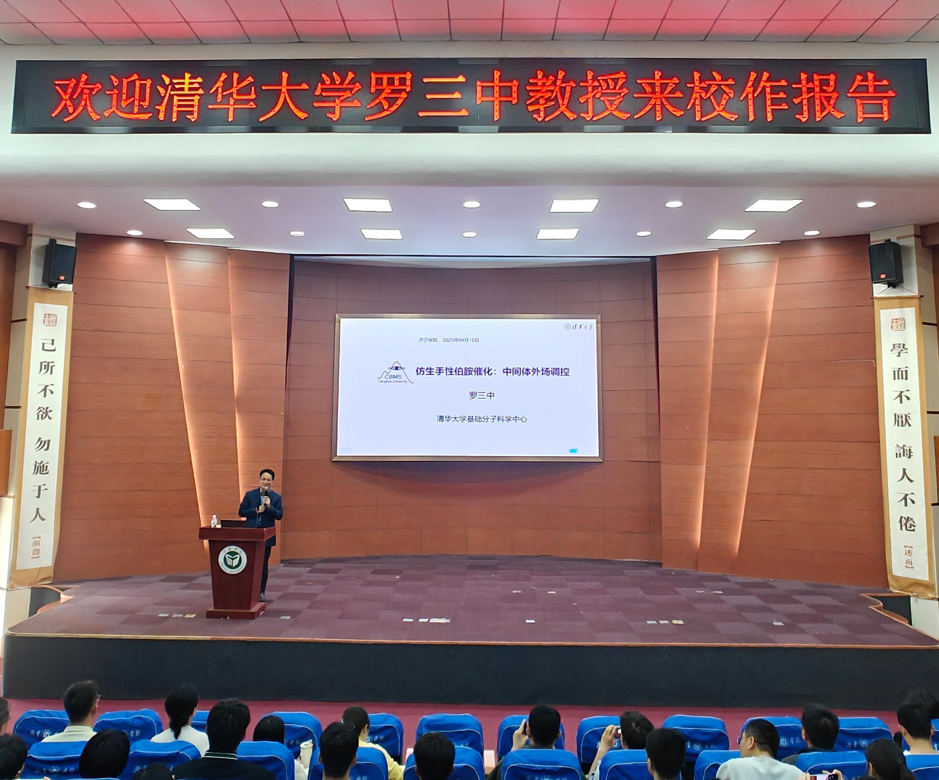 报告会由化学化工与材料学院院长刘涛主持,170余名师生参加。罗三中以“仿生小分子催化:手性中间体的外场调控”为题,聚焦仿生小分子催化领域,深入剖析了手性中间体的外场调控机制,分享其科研团队在该领域的研究成果和工作进展。