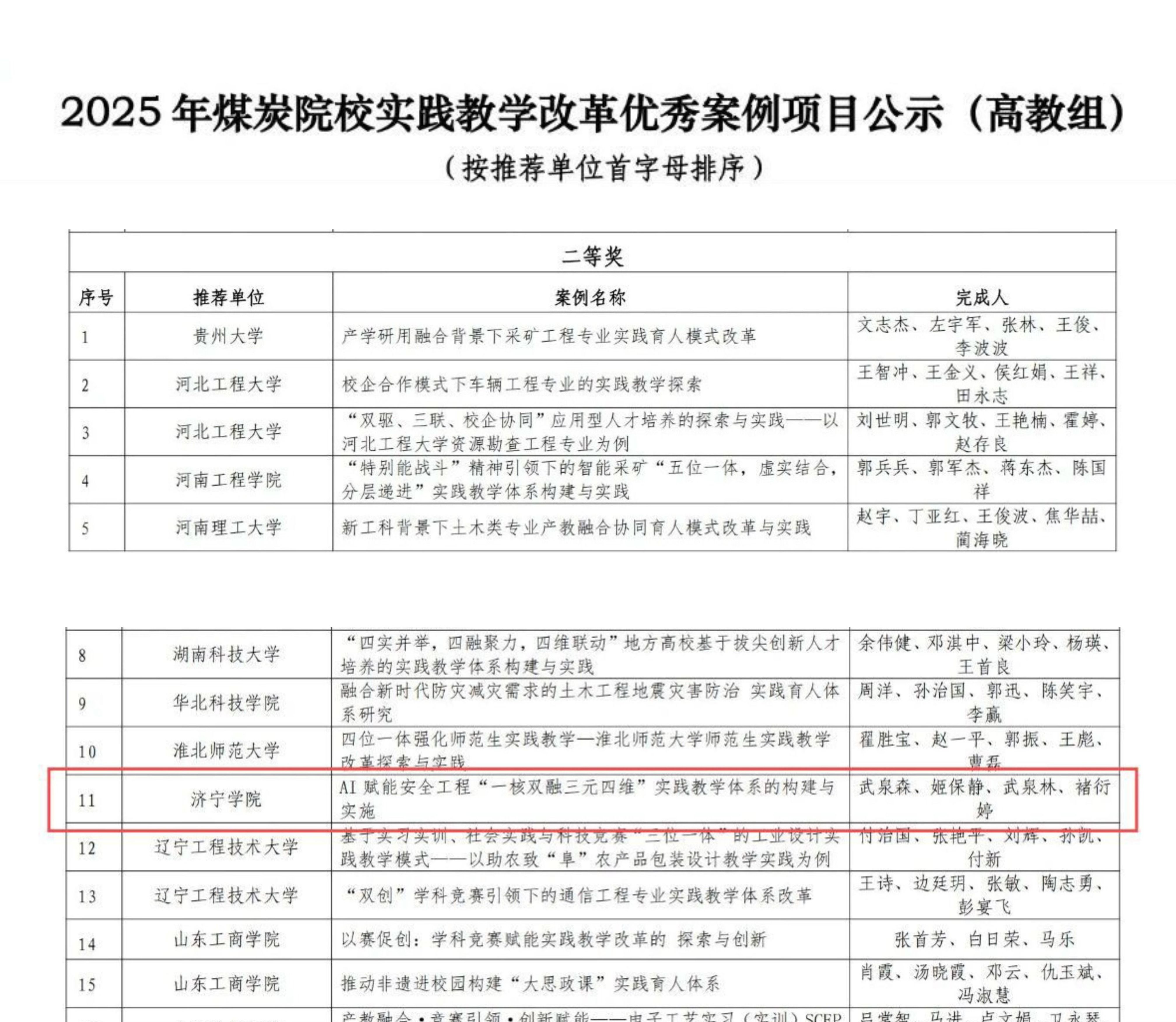 近日,中国煤炭教育协会发布《2025年煤炭类院校“实践教学改革优秀案例”遴选结果》,我校资源环境与安全工程学院申报的《AI赋能安全工程——“一核双融三元四维”实践教学体系的构建与实施》项目在高等教育组评选中荣获二等奖。