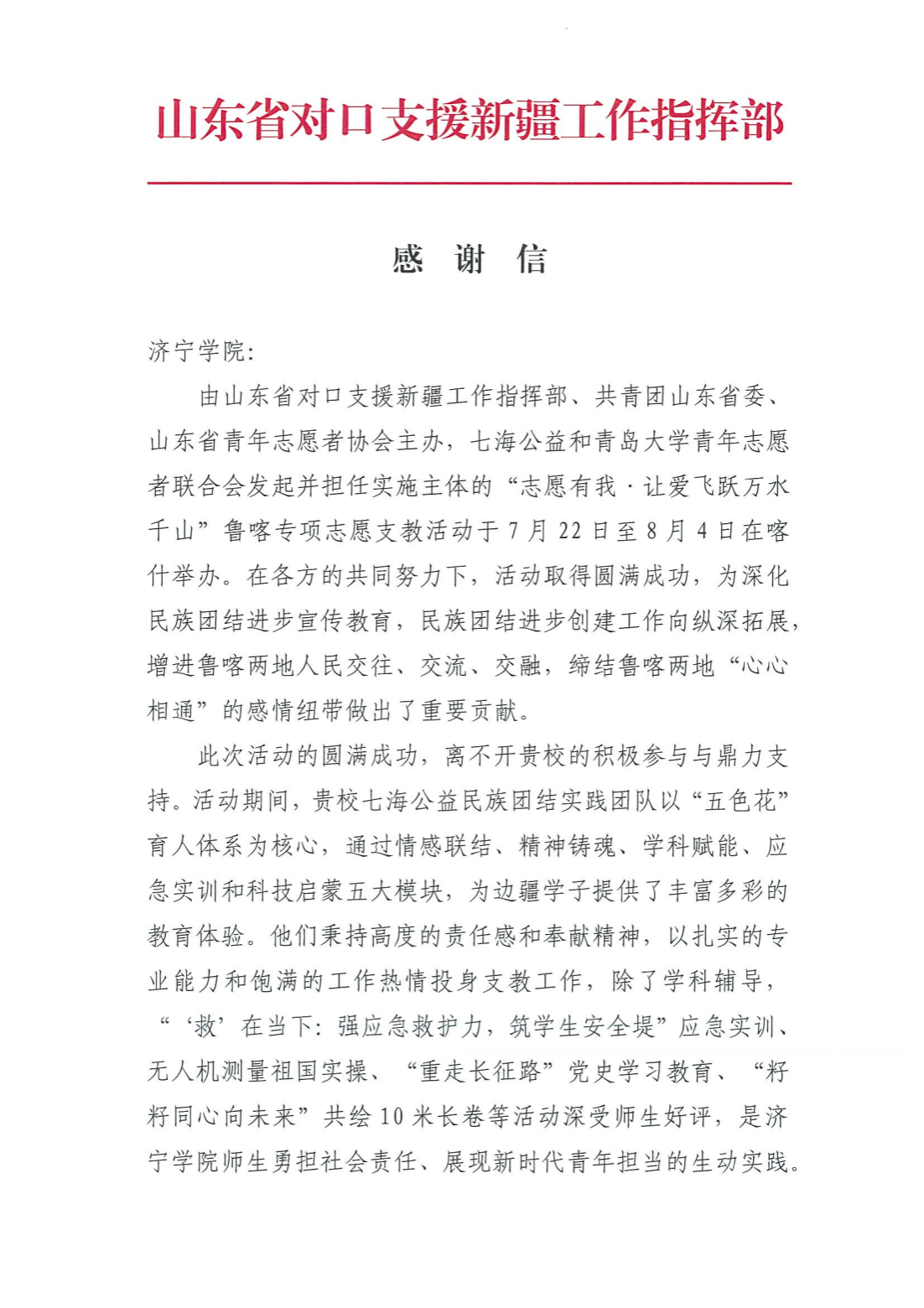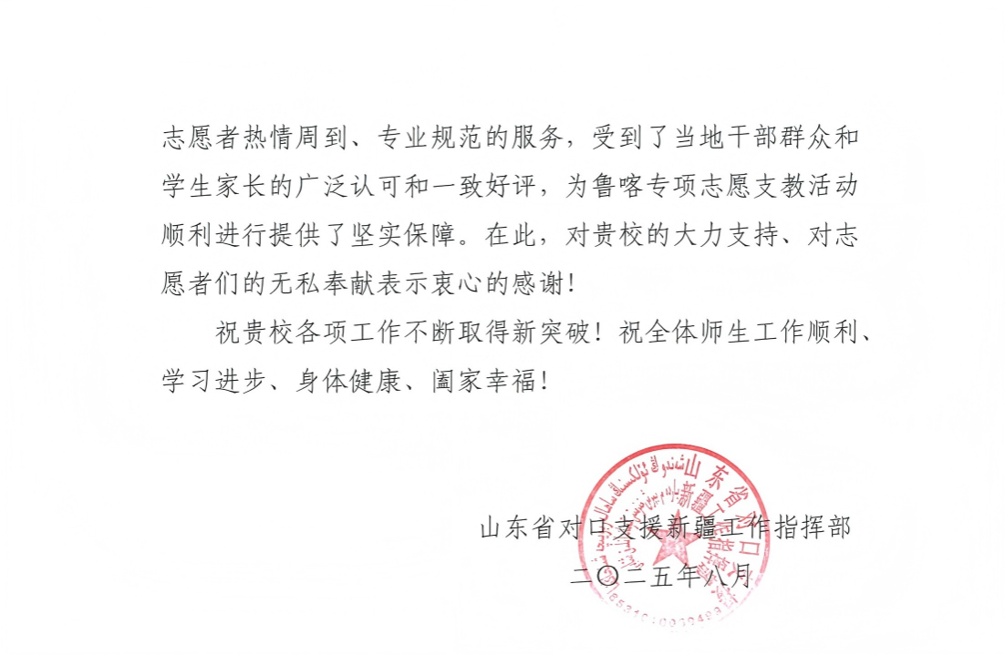 近日,山东省对口支援新疆工作指挥部发来感谢信,向我校参与“志愿有我·让爱飞跃万水千山”鲁喀专项志愿支教活动的师生表示诚挚感谢。信中指出,亚星在线登录官网师生以高度的责任感和奉献精神,凭借扎实的专业能力和饱满的工作热情投身支教,赢得了当地干部群众和学生家长的一致好评,为鲁喀专项活动的顺利开展提供了坚实保障。