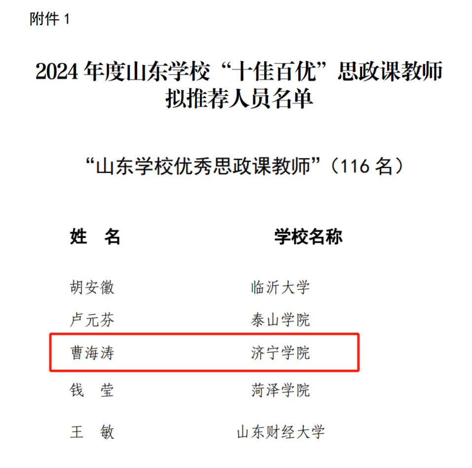 近日,中共山东省教育厅(省委教育工委)公布2024年度山东学校“十佳百优”思政课教师评选结果,我校马克思主义学院教师曹海涛荣获“山东学校优秀思政课教师”荣誉称号。