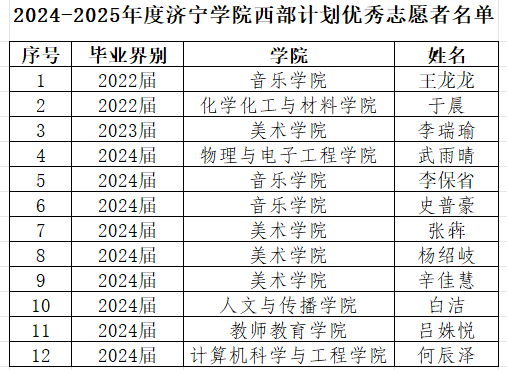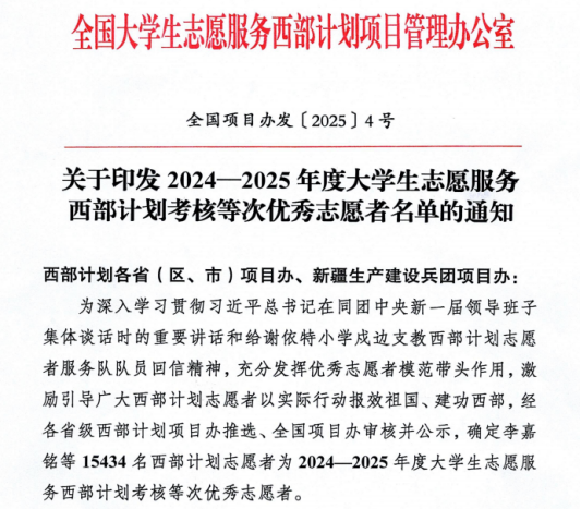 近日,全国大学生志愿服务西部计划项目管理办公室发布《关于印发2024-2025年度大学生志愿服务西部计划考核等次优秀志愿者名单的通知》,我校志愿者凭借坚定的信念、务实的作风和显著的服务成效,从全国众多志愿者中脱颖而出,赢得了服务单位和全国项目办的一致好评,在2024-2025年度我校在岗46名西部计划志愿者中,共有12名志愿者获评“优秀”等次,获评人数创历史新高,也是学校连续3年有本校学子获此殊荣。这一成绩既是对志愿者个人奉献与能力的高度认可,也是我校西部计划组织实施工作成效的集中体现。