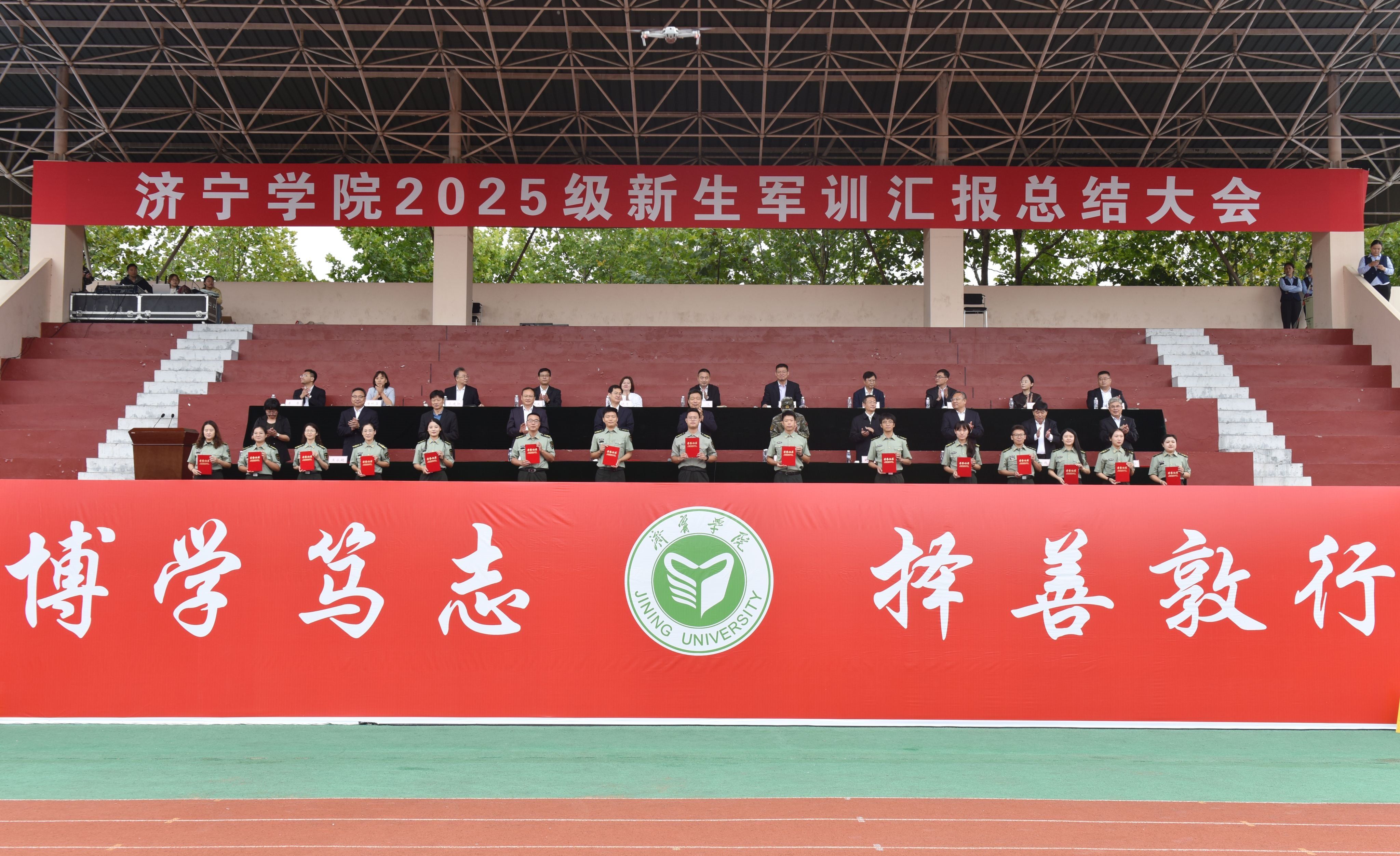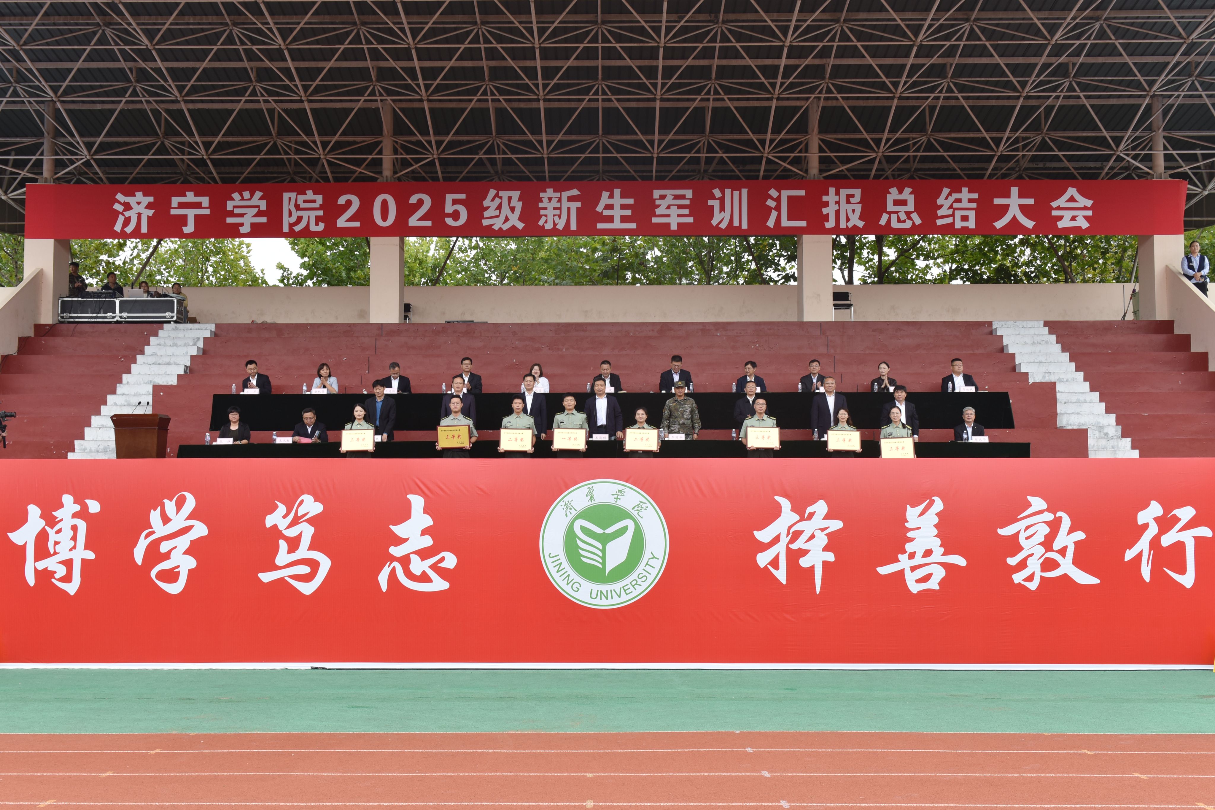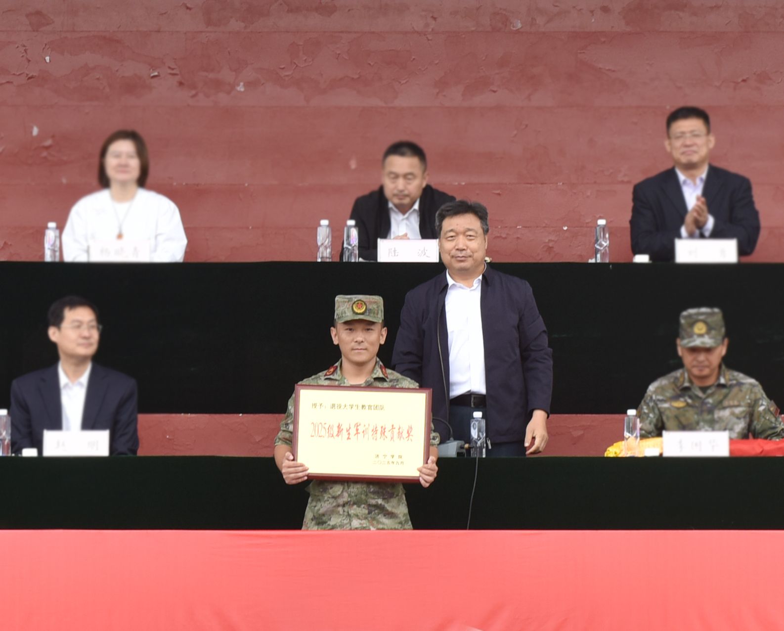 会上,王清明代表学校向武警济宁支队赠送锦旗,向退役大学生教官团队颁发特殊贡献奖。刘克非宣读了《关于表彰2025级新生军训优胜连队、优秀带训辅导员和优秀军训学员的决定》。主席台领导为获奖先进集体和先进个人代表,颁发了奖牌和证书。