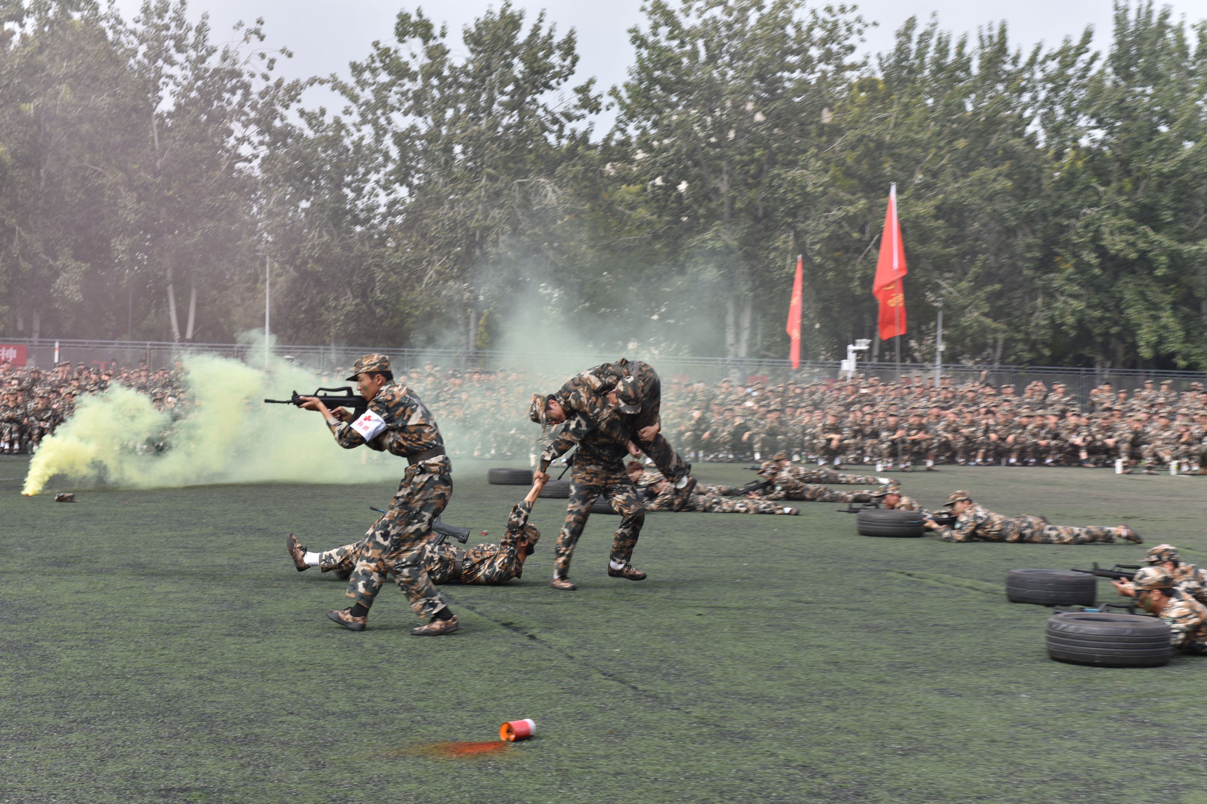 大会在雄壮的国歌声中拉开帷幕。队列会操,各方队步伐铿锵、军容整肃,尽显青春风采;方阵展示,擒敌拳、应急棍、匕首操、刺杀操刚劲凌厉、整齐划一,凝聚昂扬锐气;战术演练,学员们穿越火线、匍匐前进,在擒拿格斗、战场救护等实战科目中锤炼本领。全体参训学生以饱满姿态投入,精彩表现赢得阵阵掌声,尽显新时代青年蓬勃朝气与坚毅品格。
