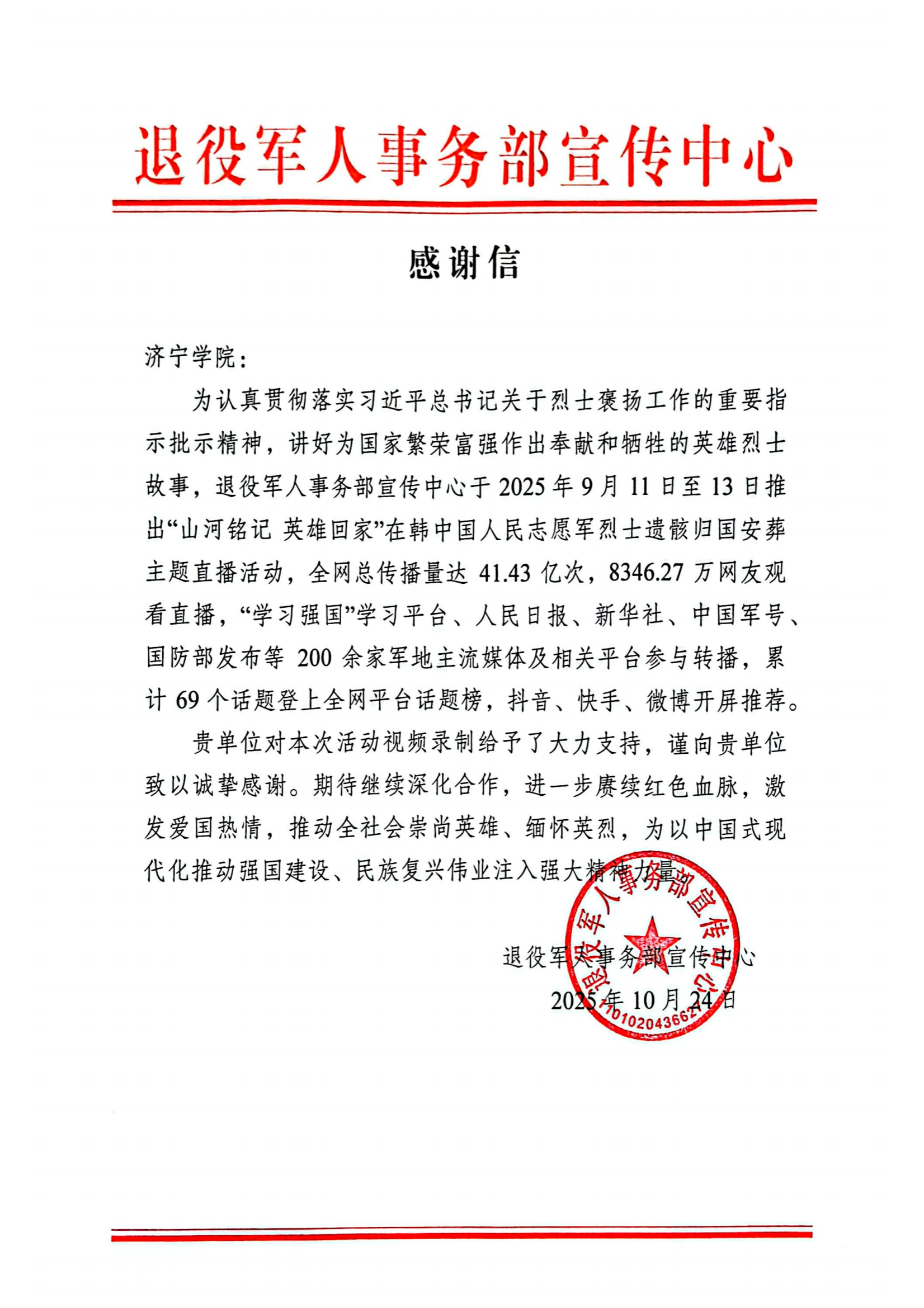近日,退役军人事务部宣传中心向我校发来感谢信,对我校在参加“山河铭记 英雄回家”在韩中国人民志愿军烈士遗骸归国安葬主题直播活动中的贡献表示感谢。