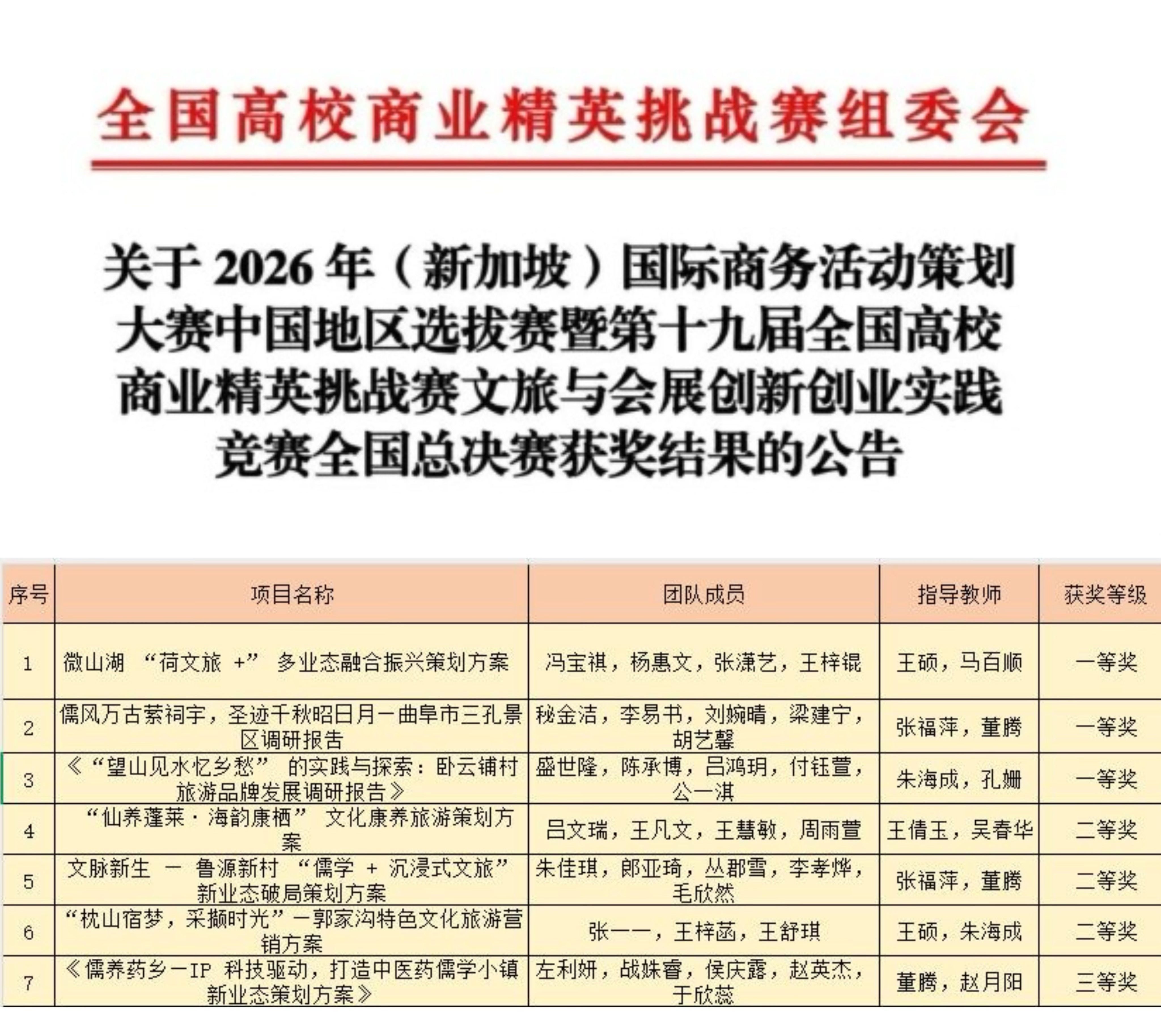 全国高校商业精英挑战赛文旅与会展创新创业实践竞赛是全国普通高校大学生竞赛排行榜榜单赛事之一,目前已成为我国文旅与会展教育领域中,院校覆盖全面、校企合作深入、国际交流广泛的赛事活动。自赛事启动以来,经济管理学院迅速响应、细致组织,围绕参赛项目开展多轮打磨优化,助力团队成员显著提升交流沟通与协同合作水平。参赛过程中,参赛团队通过竞赛系统提交策划书及展示视频,再经专家答辩环节全面呈现项目的核心思路、核心内容与落地实施计划,圆满完成了全流程赛事比拼,取得了比赛佳绩。