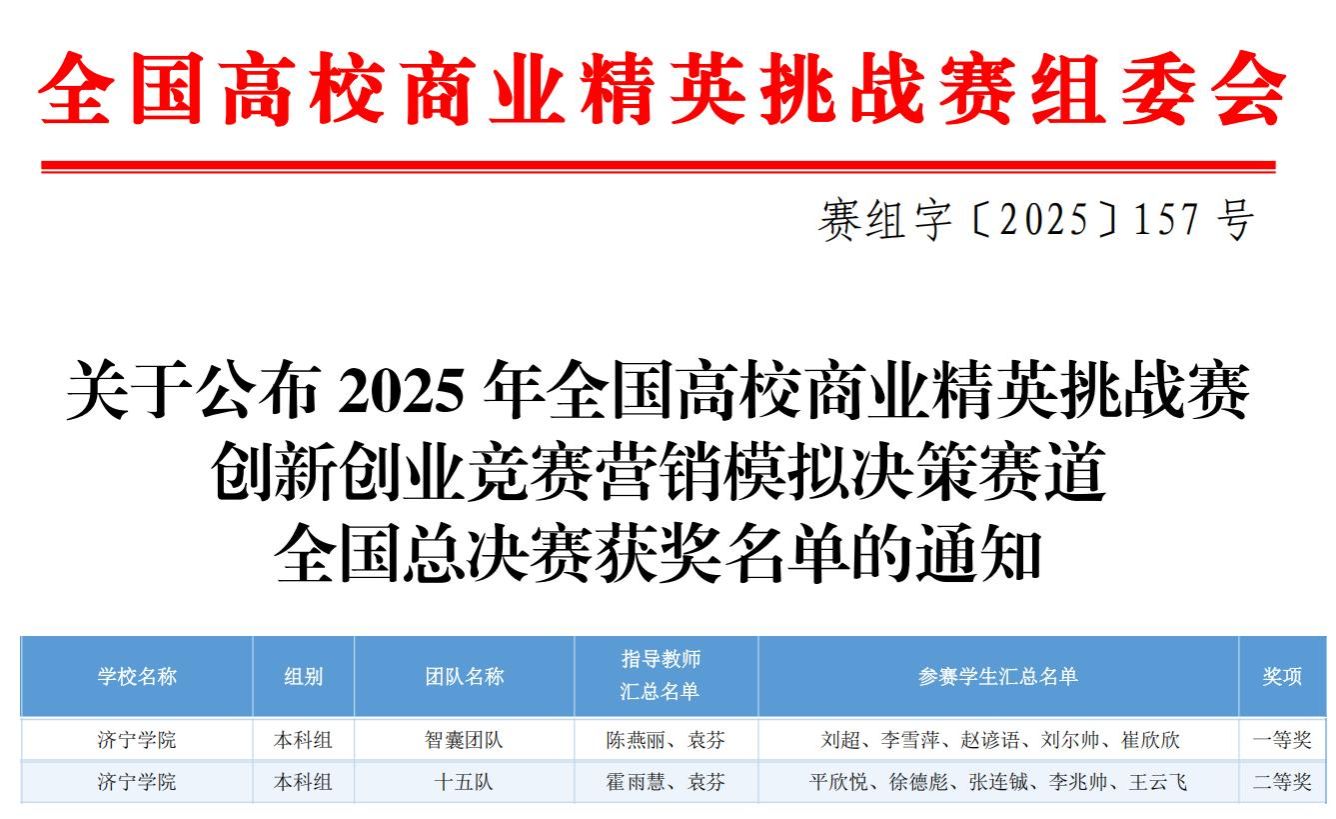 近日,中国国际贸易促进委员会商业行业委员会、中国国际商会商业行业商会和中国商业经济学会联合主办的2025年全国高校商业精英挑战赛创新创业竞赛营销模拟决策赛道全国总决赛落下帷幕。经过激烈角逐,我校经济管理学院代表队斩获国家级一等奖1项、二等奖1项。
